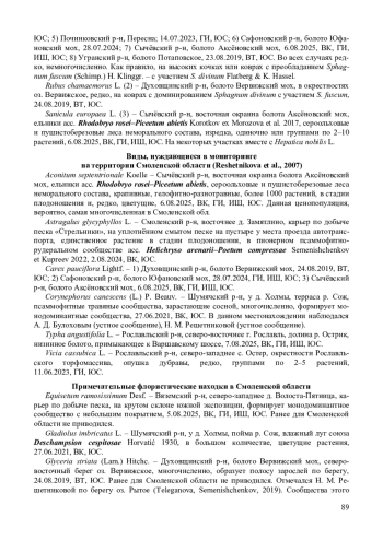 В 2019–2025 гг. авторами проводились флористико-геоботанические исследования на территории Смоленской области, в ходе которых были выявлены местонахождения некоторых редких, нуждающихся в охране и занесённых в региональную Красную книгу (Perechen’…, 2012) видов растений, а также видов с недостаточно изученным распространением и нуждающихся в мониторинге (Reshetnikova et al., 2007).