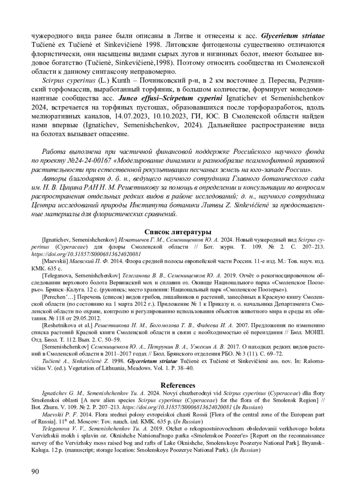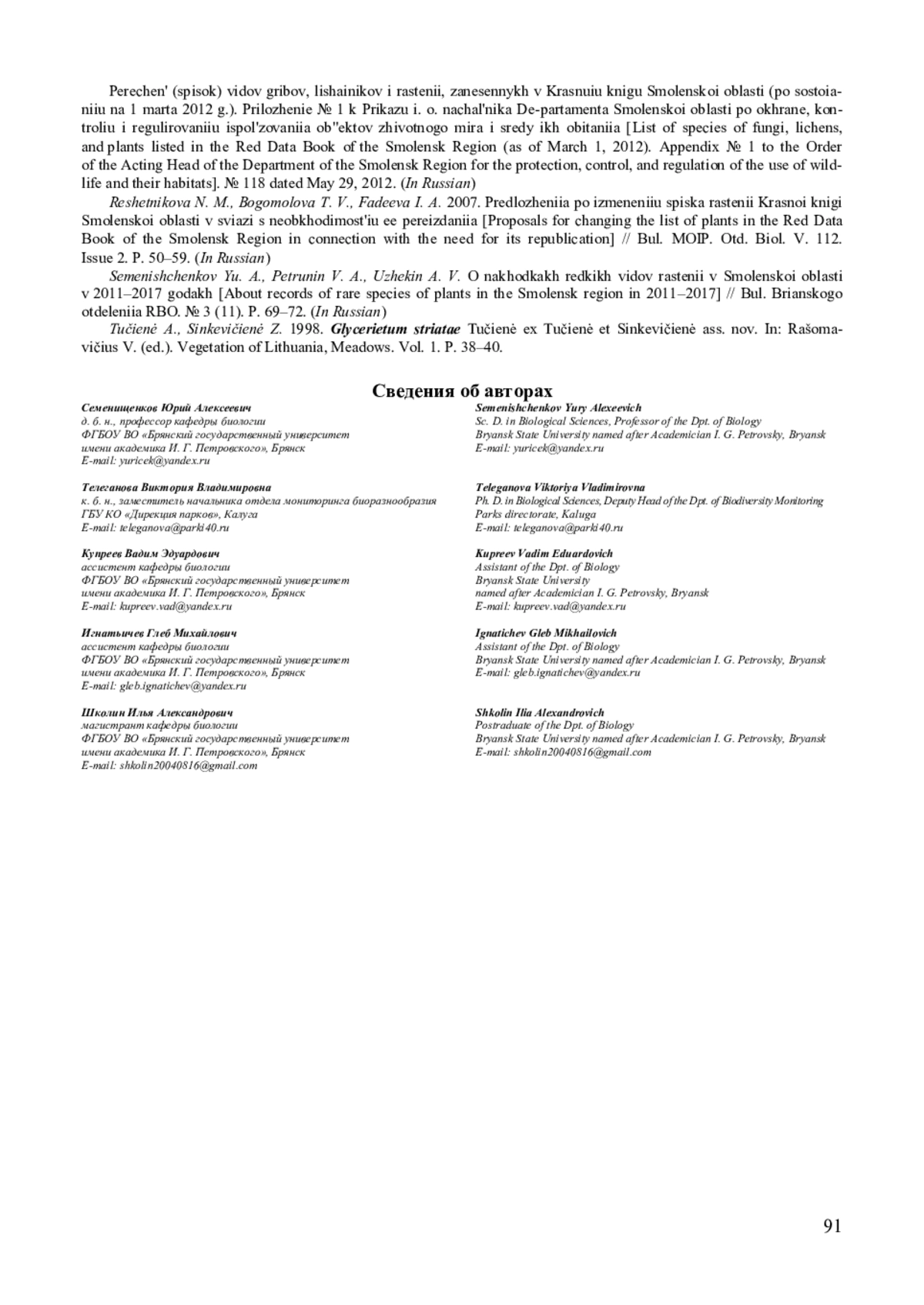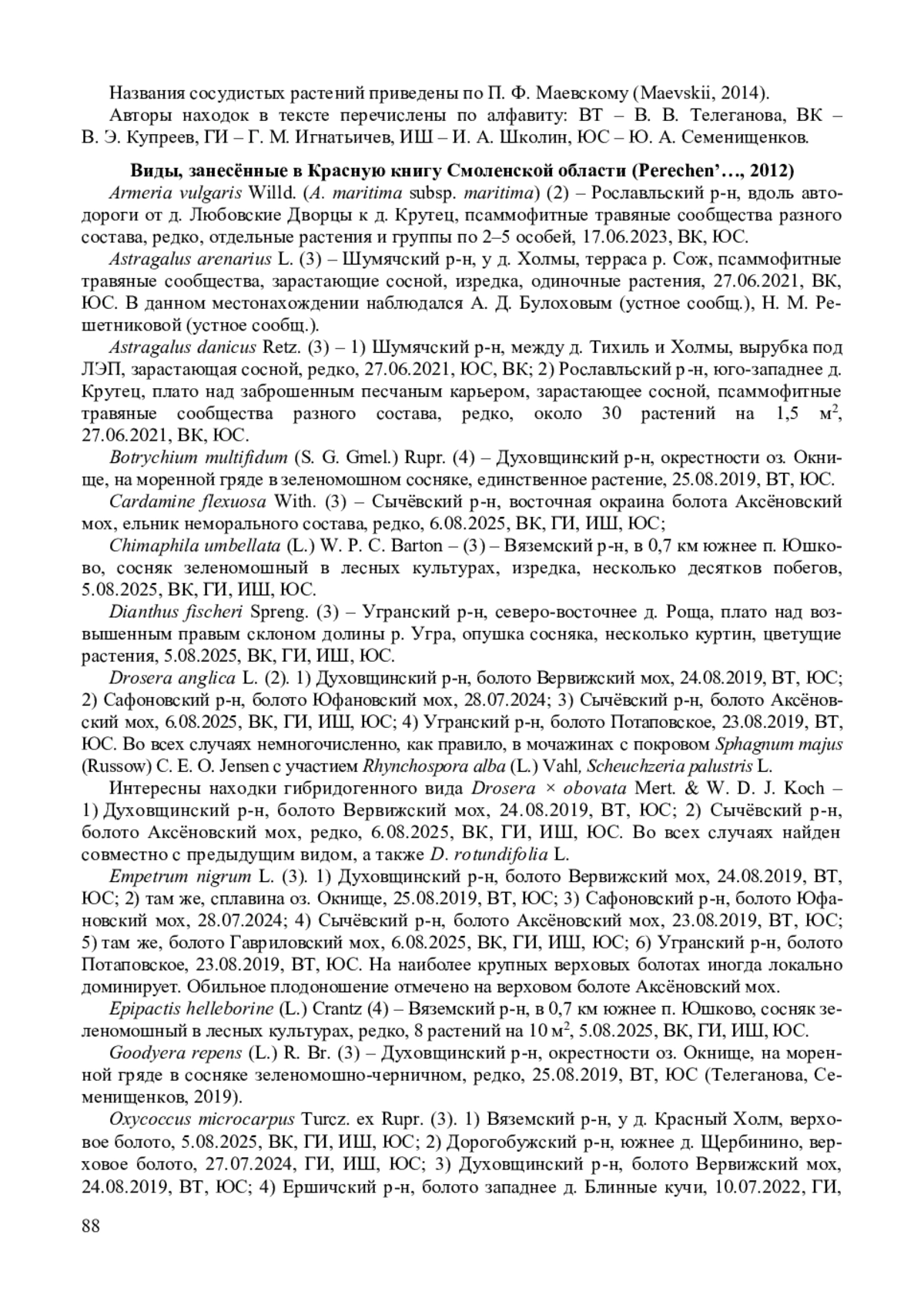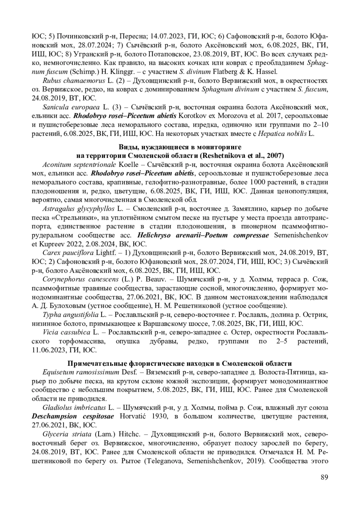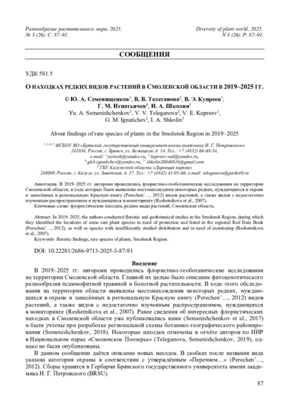 СЕМЕНИЩЕНКОВ Ю. А., ТЕЛЕГАНОВА В. В., КУПРЕЕВ В. Э., ИГНАТЬИЧЕВ Г. М., ШКОЛИН И. А. О НАХОДКАХ РЕДКИХ ВИДОВ РАСТЕНИЙ В СМОЛЕНСКОЙ ОБЛАСТИ В 2019–2025 ГГ. // РАЗНООБРАЗИЕ РАСТИТЕЛЬНОГО МИРА. 2025. № 3 (26)