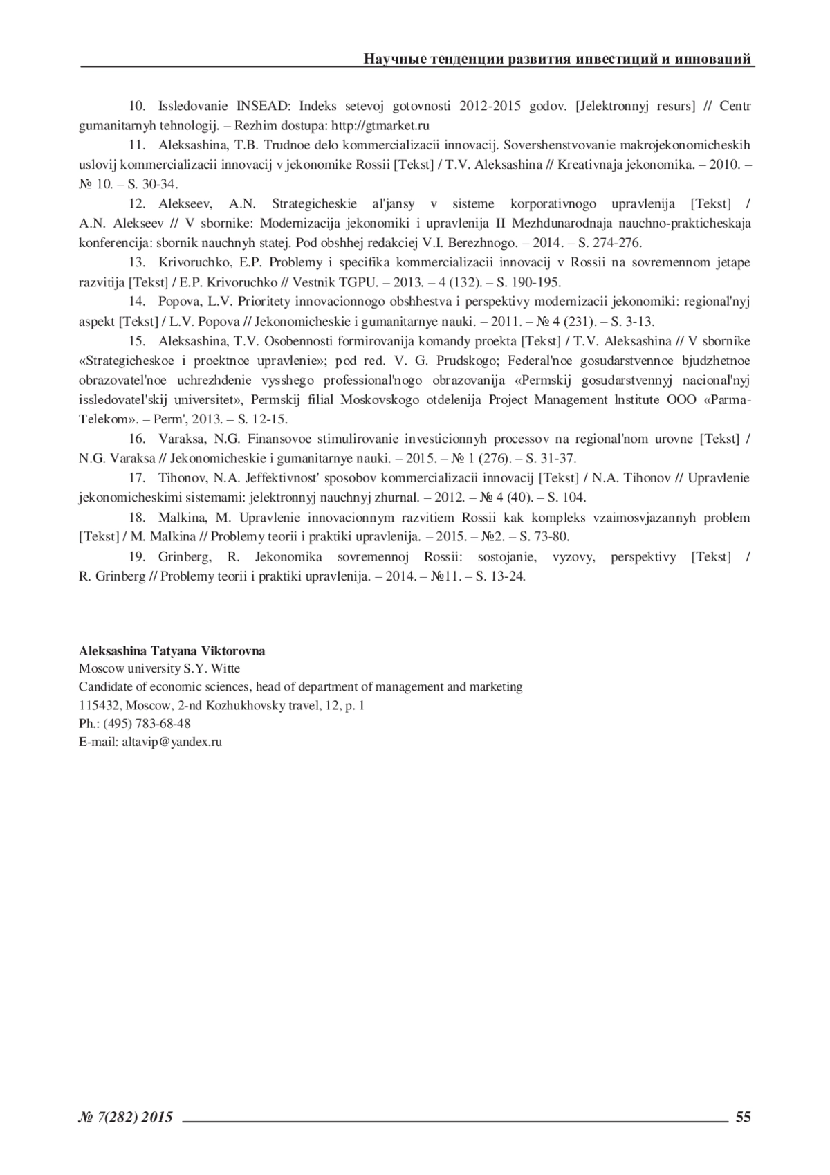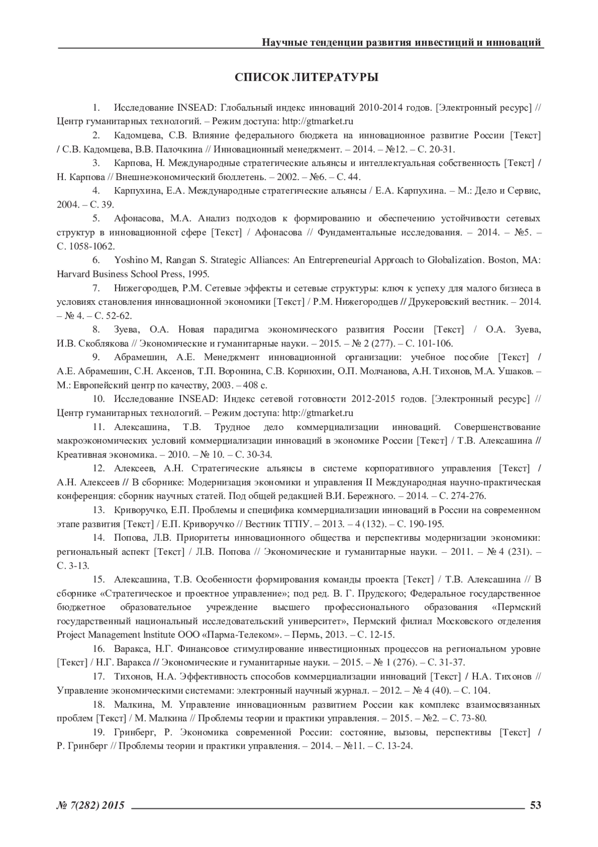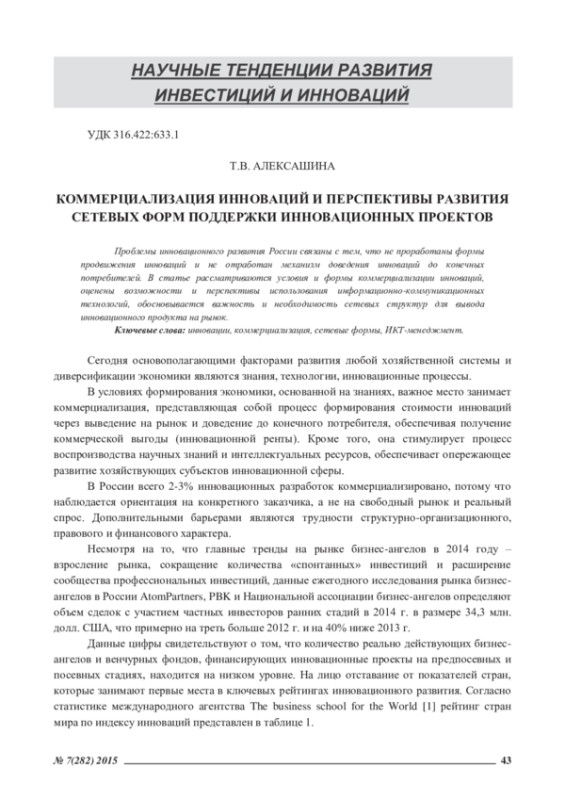 АЛЕКСАШИНА Т. В. КОММЕРЦИАЛИЗАЦИЯ ИННОВАЦИЙ И ПЕРСПЕКТИВЫ РАЗВИТИЯ СЕТЕВЫХ ФОРМ ПОДДЕРЖКИ ИННОВАЦИОННЫХ ПРОЕКТОВ // ЭКОНОМИЧЕСКИЕ И ГУМАНИТАРНЫЕ НАУКИ. 2015. № 7 (282)