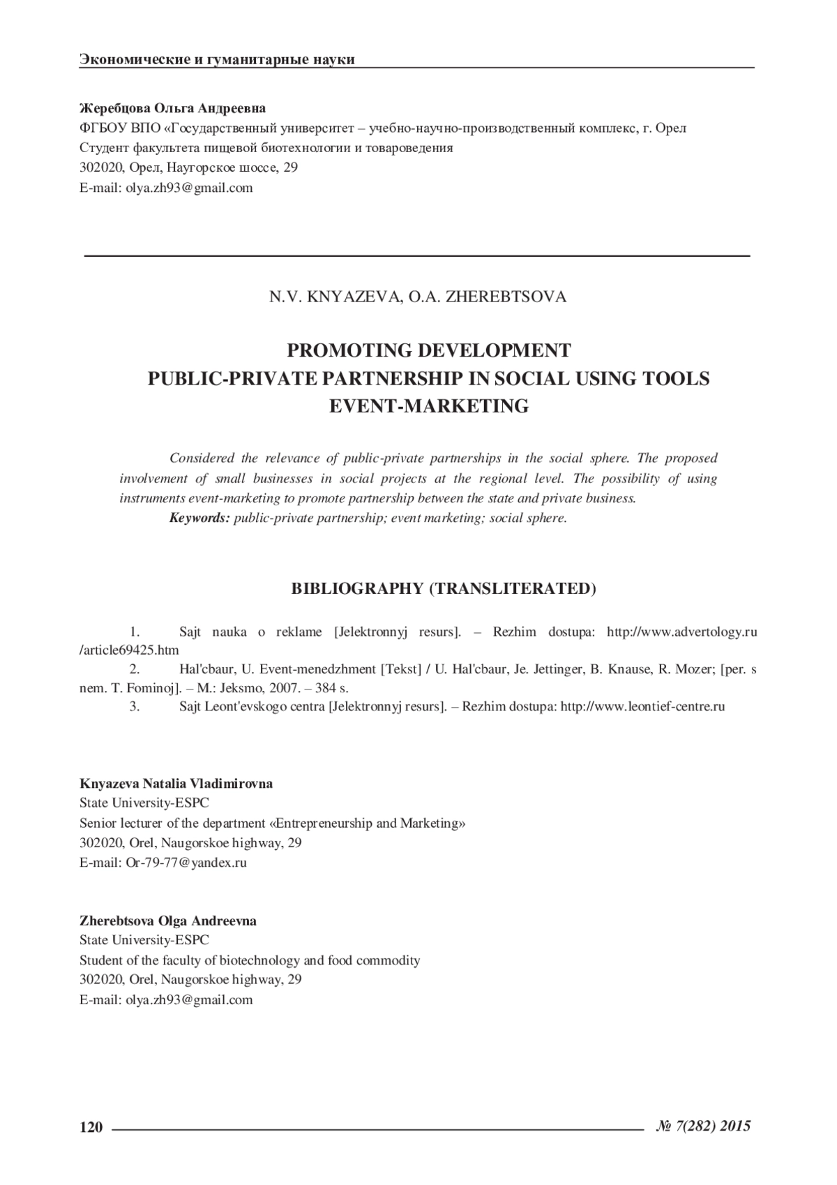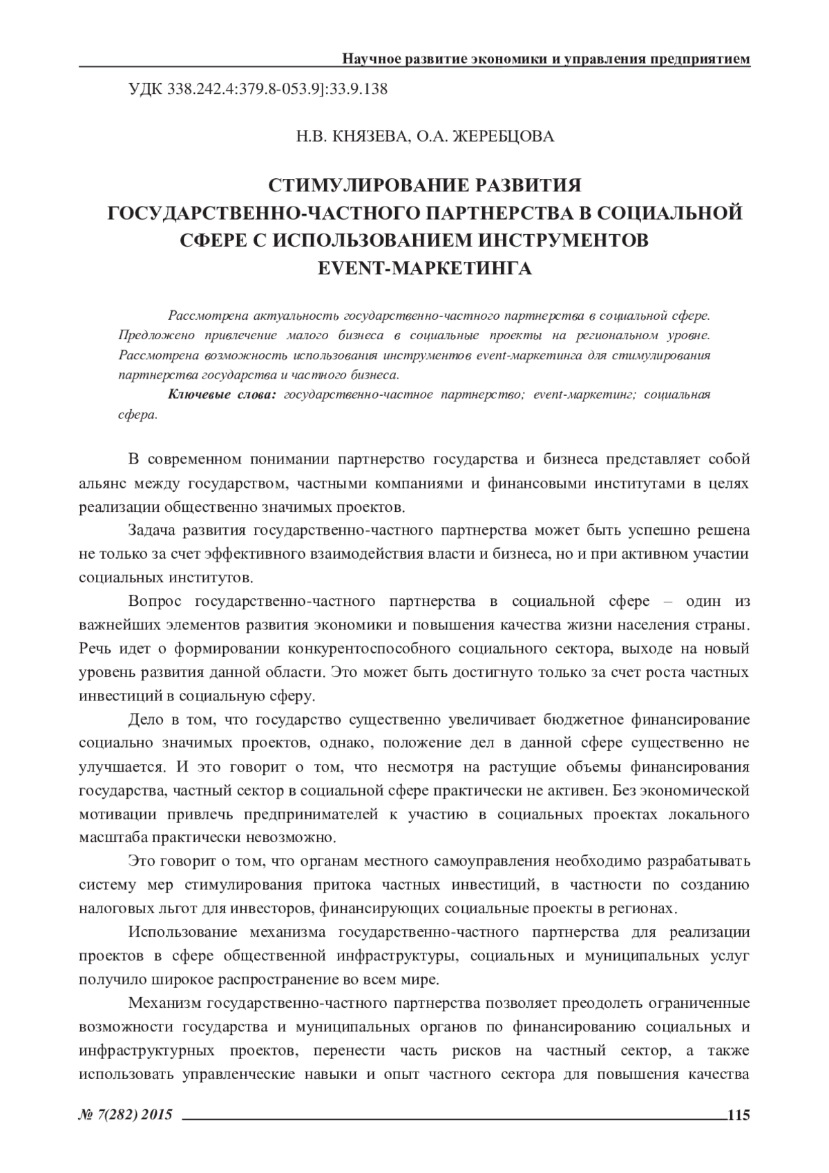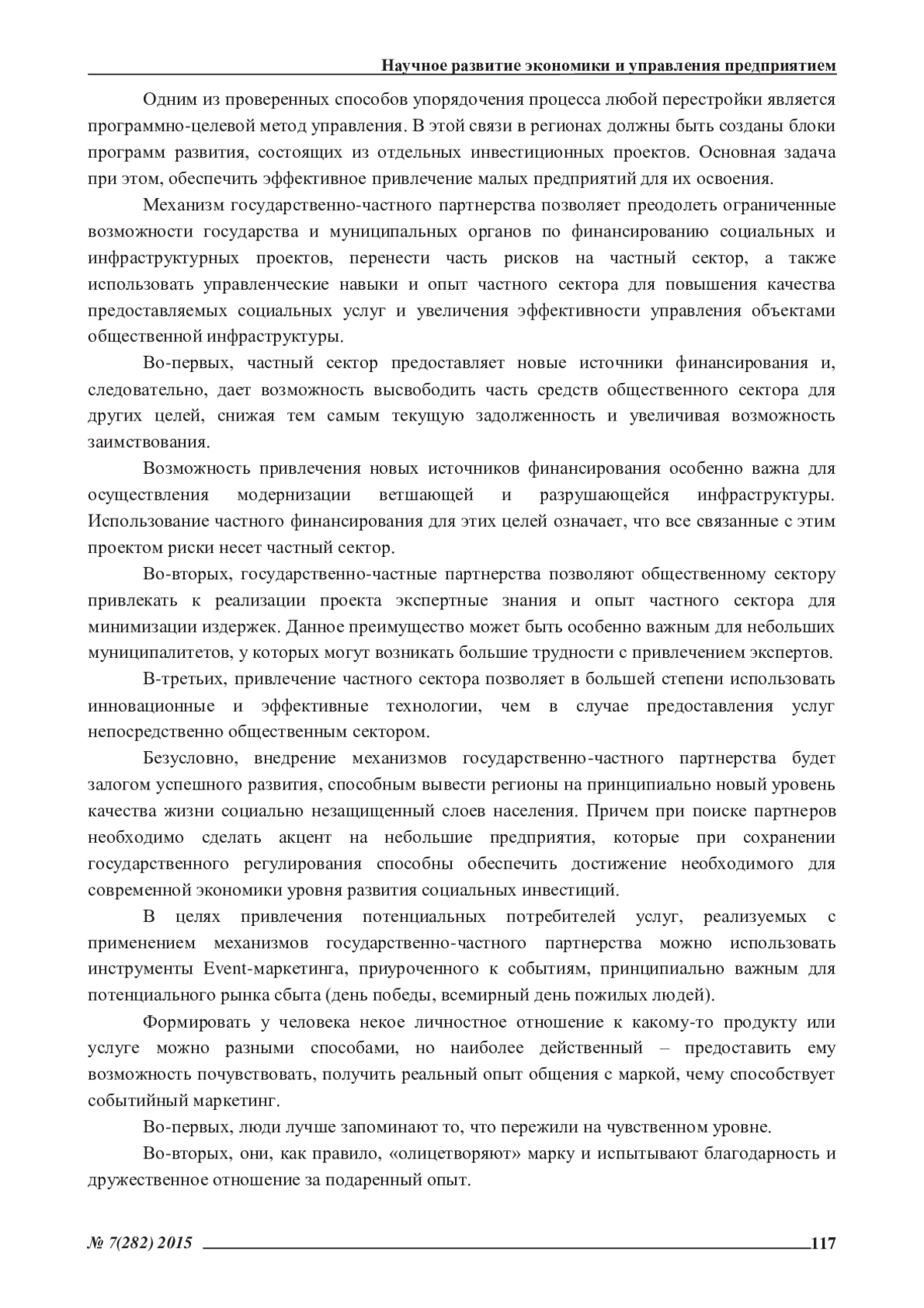 Рассмотрена актуальность государственно-частного партнерства в социальной сфере. Предложено привлечение малого бизнеса в социальные проекты на региональном уровне. Рассмотрена возможность использования инструментов event-маркетинга для стимулирования партнерства государства и частного бизнеса