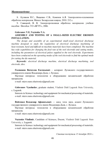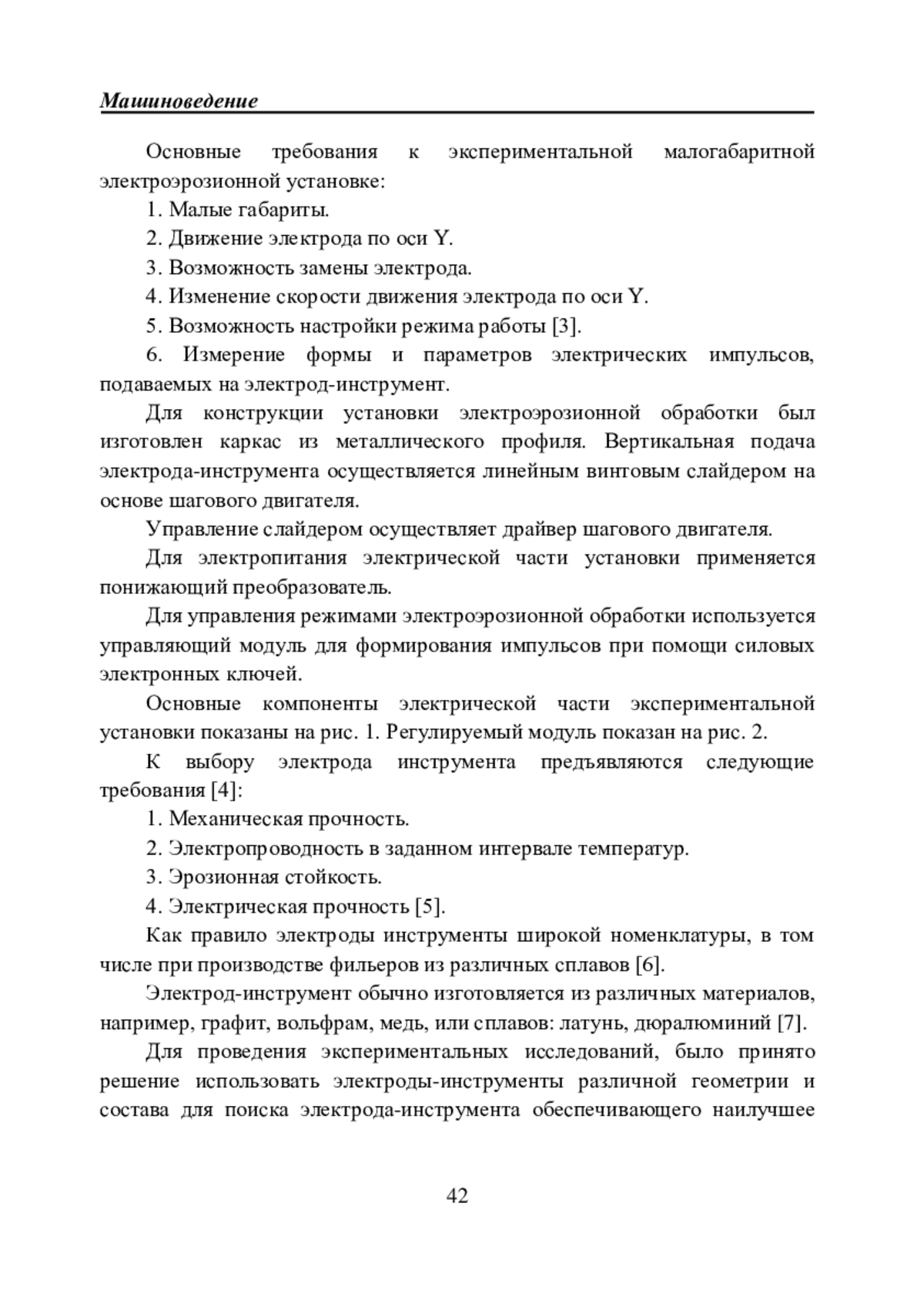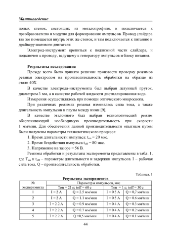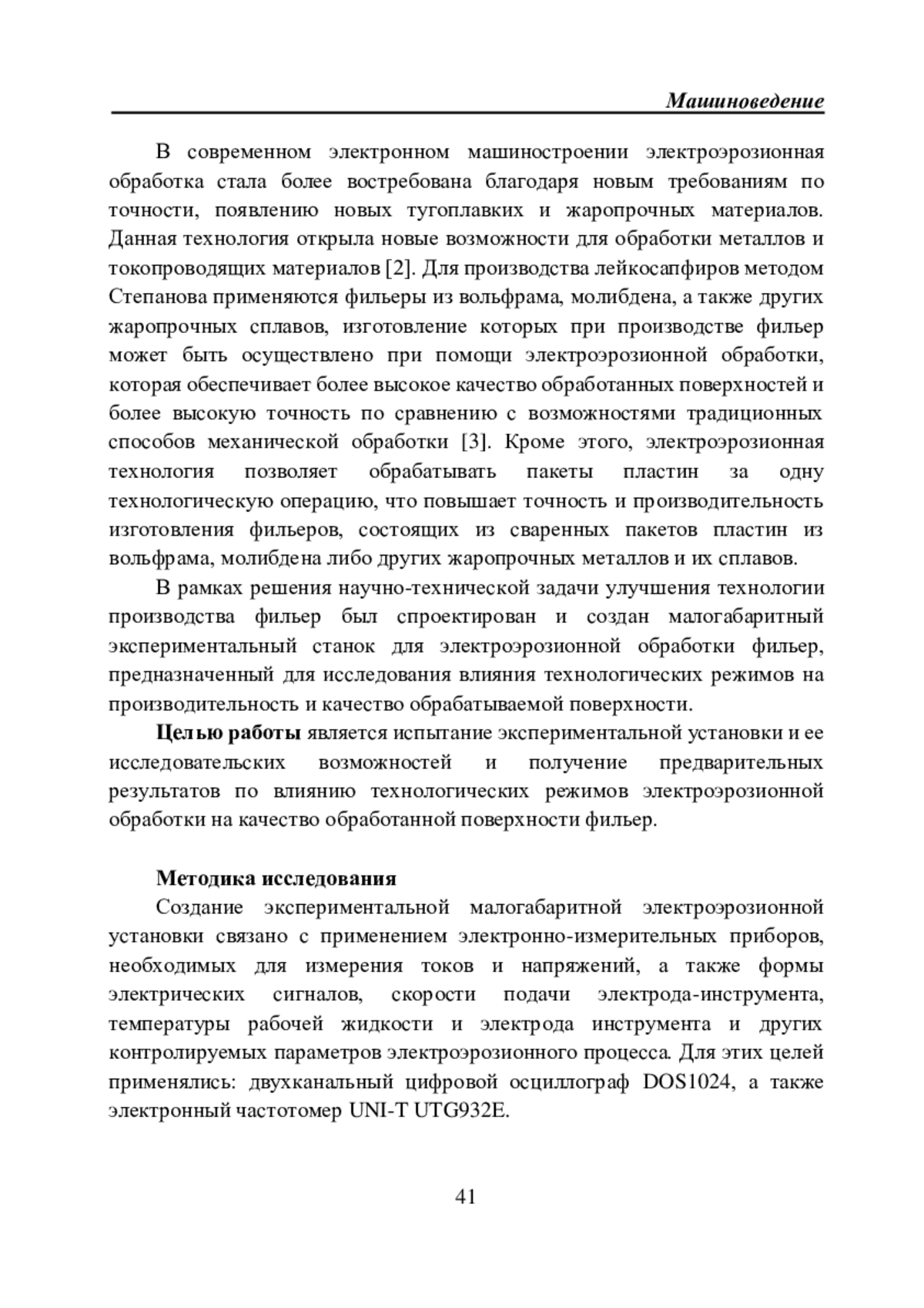 Выполнены проектирование и сборка экспериментальной малогабаритной электроэрозионной установки, предназначенной для исследования закономерностей электроэрозионной обработки жаропрочных, твердых и труднообрабатываемых материалов. В установке заложены широкие возможности по изменению скорости подачи электрода-инструмента и режимов резания, включая параметры электрических импульсов, подаваемых на электрод-инструмент. Проведены эксперименты режимов работы электрода-инструмента для поиска оптимального режима резанья материала фильеры.