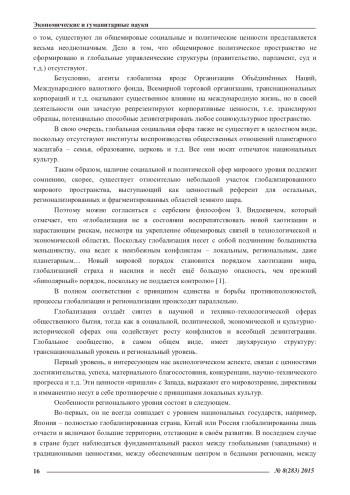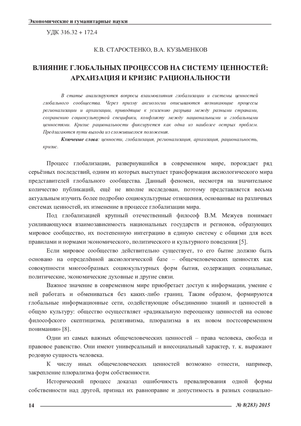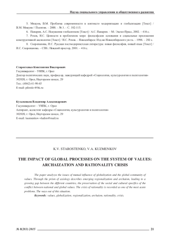 В статье анализируются вопросы взаимовлияния глобализации и системы ценностей глобального сообщества. Через призму аксиологии описываются возникающие процессы регионализации и архаизации, приводящие к усилению разрыва между разными странами, сохранению социокультурной специфики, конфликту между национальными и глобальными ценностями. Кризис рациональности фиксируется как одна из наиболее острых проблем. Предлагаются пути выхода из сложившегося положения
