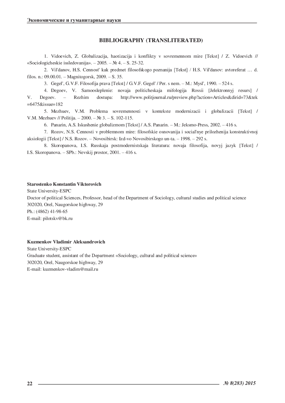 1. Видоевич, З. Глобализация, хаотизация и конфликты в современном мире [Текст] / З. Видоевич // «Социологические исследования». - 2005. - № 4. - С. 25-32. EDN: OOZEXJ