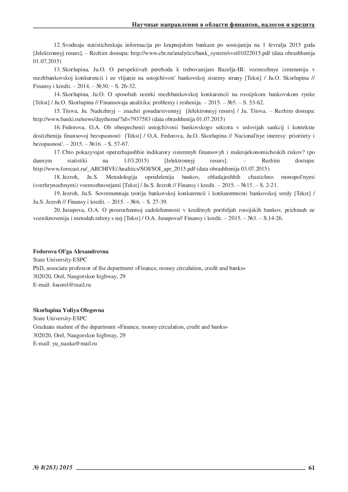 16. Федорова, О.А. Об обеспечении устойчивости банковского сектора в условиях санкций и контексте достижения финансовой безопасности [Текст] / О.А. Федорова, Ю.О. Скорлупина // Национальные интересы: приоритеты и безопасность. - 2015. - №16. - С. 57-67. EDN: TPUWAX
