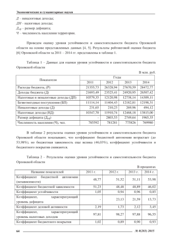 В статье представлен комплекс финансовых показателей для оценки устойчивости, независимости и ориентированности бюджета Орловской области. Проведена оценка уровня устойчивости и самостоятельности бюджета Орловской области. Установлено, что за период 2011-2014 гг. Орловская область являлась дотационным и депрессивным регионом. Бюджет области неустойчив, несбалансирован, с высоким уровнем зависимости от федерального центра. Рассмотрены основные виды сбалансированности бюджета и методики оценки ее качества. Предложены направления достижения сбалансированного состояния бюджета Орловской области.