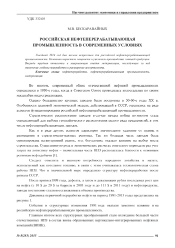 Во многом, современный облик отечественной нефтяной промышленности определился в 1930-е годы, когда в Советском Союзе проводилась колоссальная по своим масштабам индустриализация. Однако большинство крупных заводов были построены в 50-60-е годы ХХ в. Особенности плановой экономической модели, действовавшей в СССР, отразились на ряде аспектов функционирования российской нефтеперерабатывающей промышленности. Стратегическое расположение заводов в случае начала войны во многом стала определяющей для выбора географического расположения целого ряда предприятий, в том числе нефтеперерабатывающих заводов