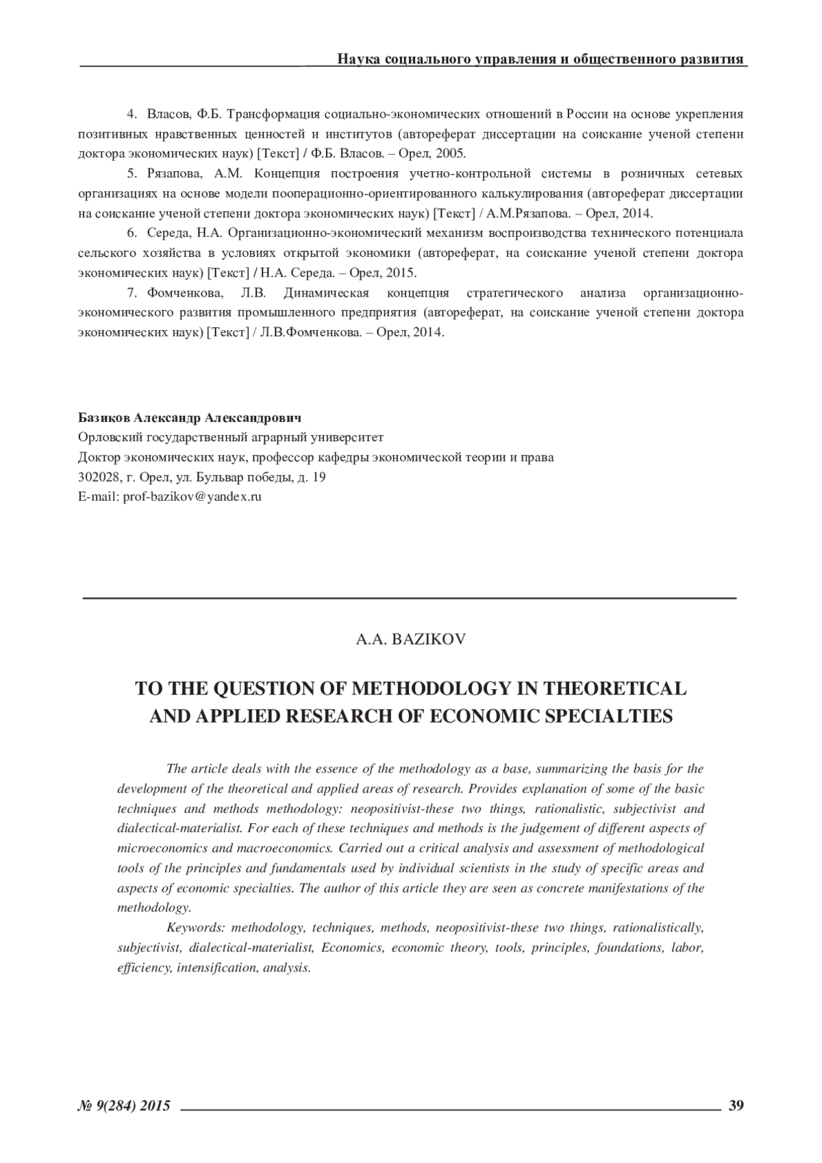 Теоретико-прикладные исследования, проводимые учеными и практиками в различных областях экономических специальностей, не отличаются, как показывает практика, обоснованной однозначностью. Это и понятно, так, каждый из субъектов, занимающийся исследованиями, располагает различным уровнем знаний, умений, навыков и возможностей. Тем не менее, используя опыт прошлого и настоящего все они, и каждый в отдельности, в своей исследовательской работе приходят к каким-то конкретным способам, методам и приемам, имеющим определенную идентичность. Проявляется это, в частности в том, что авторы формулируют в соответствии в той или иной экономической специальностью конкретные теоретические и прикладного характера разработки. Они аргументируются более обосновано, если в их очевидной мере просматривается методология