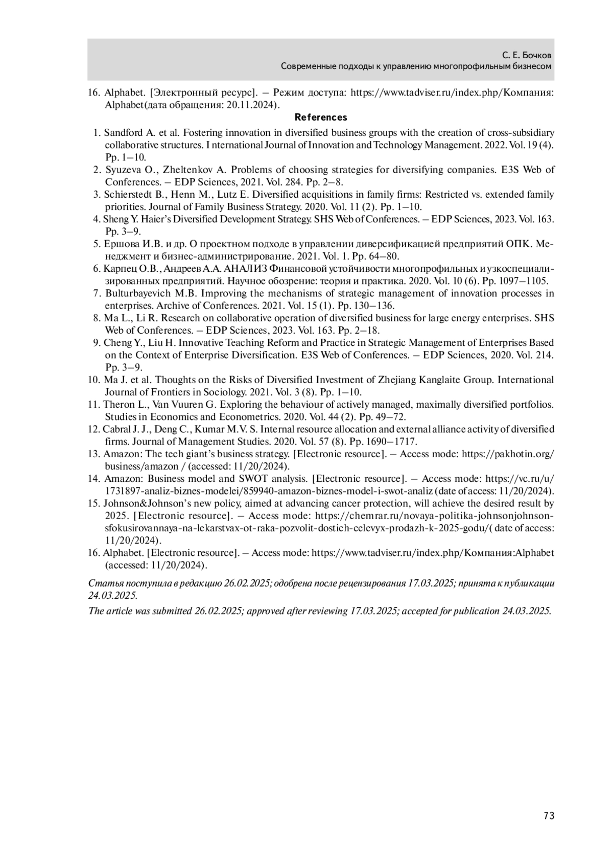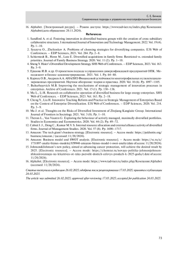 1. Sandford A. et al. Fostering innovation in diversified business groups with the creation of crosssubsidiary collaborative structures. International Journal of Innovation and Technology Management. 2022. Т. 19. №. 04. С. 1-10.