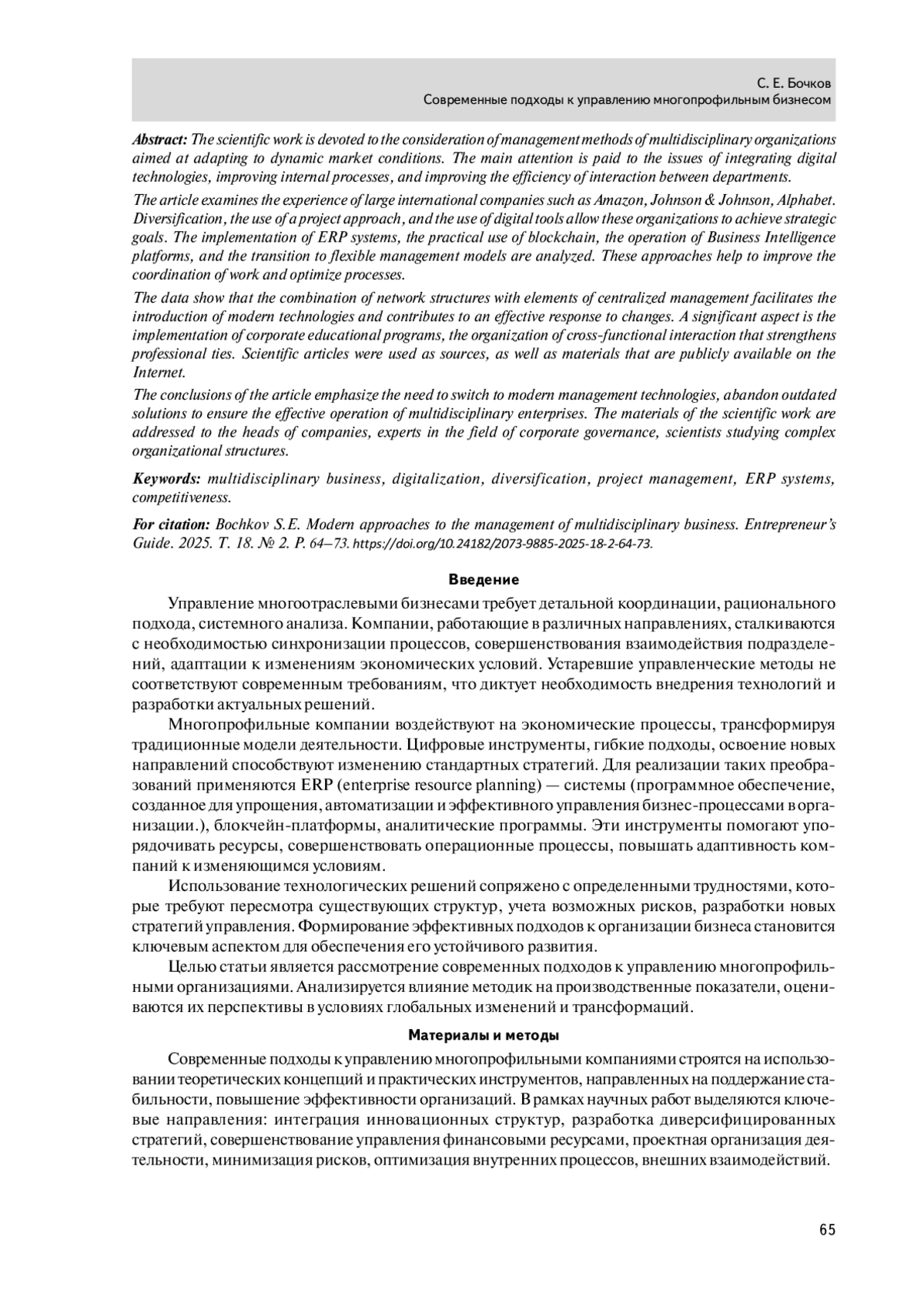 Научная работа посвящена рассмотрению методов управления многопрофильными организациями, направленных на адаптацию к динамичным условиям рынка. Основное внимание уделено вопросам интеграции цифровых технологий, совершенствования внутренних процессов, повышения эффективности взаимодействия между подразделениями. В статье изучен опыт крупных международных компаний, таких как Amazon, Johnson & Johnson, Alphabet. Диверсификация, использование проектного подхода, применение цифровых инструментов позволяют этим организациям достигать стратегических целей. Анализируются внедрение ERP–систем, практическое использование блокчейна, эксплуатация платформ Business Intelligence, переход на гибкие модели управления. Эти подходы способствуют улучшению координации работы, оптимизации процессов. Данные показывают, что комбинация сетевых структур с элементами централизованного управления облегчает внедрение современных технологий, способствует эффективной реакции на изменения. Значимым аспектом является реализация корпоративных образовательных программ, организация межфункционального взаимодействия, укрепляющего профессиональные связи. В качестве источников были использованы научные статьи, а также материалы, которые содержатся в открытом доступе в сети «Интернет». Выводы статьи подчеркивают необходимость перехода к современным управленческим технологиям, отказа от устаревших решений для обеспечения эффективной деятельности многопрофильных предприятий. Материалы научной работы адресованы руководителям компаний, экспертам в области корпоративного управления, ученым, изучающим сложные организационные структуры.
