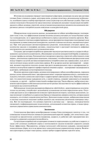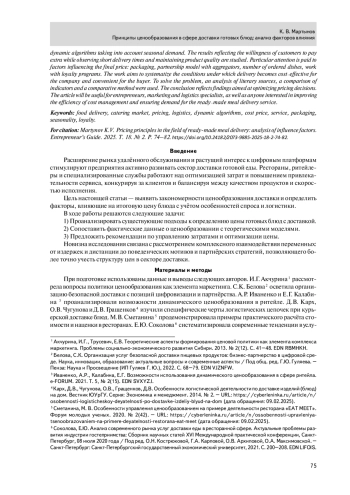 В рамках исследования описаны наиболее востребованные принципы ценообразования: затратные, ориентированные на конкурентов, а также динамические алгоритмы с учётом сезонного спроса. Изучены результаты, отражающие готовность заказчиков доплачивать при соблюдении коротких сроков доставки и сохранении качества продукции. Особое внимание отводится факторам влияния на конечную цену: упаковка, партнёрская модель с агрегаторами, количество заказанных блюд, работа с программами лояльности. Работа ставит перед собой задачу систематизировать условия, при которых доставка становится экономически эффективной для компании и удобной для покупателя. Для решения применены анализ литературных источников, сопоставление показателей и сравнительный метод. В заключении отражены выводы, ориентированные на оптимизацию ценовых решений. Статья будет полезна предпринимателям, специалистам маркетинга и логистики, а также всем, кто заинтересован в повышении эффективности управления затратами и обеспечении востребованности сервиса доставки готовых блюд.