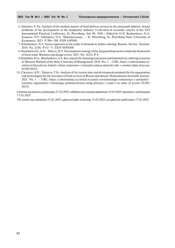 10. Чернова, А.Д., Токарева, Т.Ю. Анализ современного состояния и перспектив развития организации и технологий предоставления услуг питания в России и за рубежом. Гуманитарный научный журнал. 2021. № 1. - URL: https://cyberleninka.ru/article/n/analiz-sovremennogo-sostoyaniya-i-perspektiv-razvitiya-organizatsii-i-tehnologiy-predostavleniya-uslug-pitaniya-v-rossii-i-za (дата обращения: 09. 02. 2025).