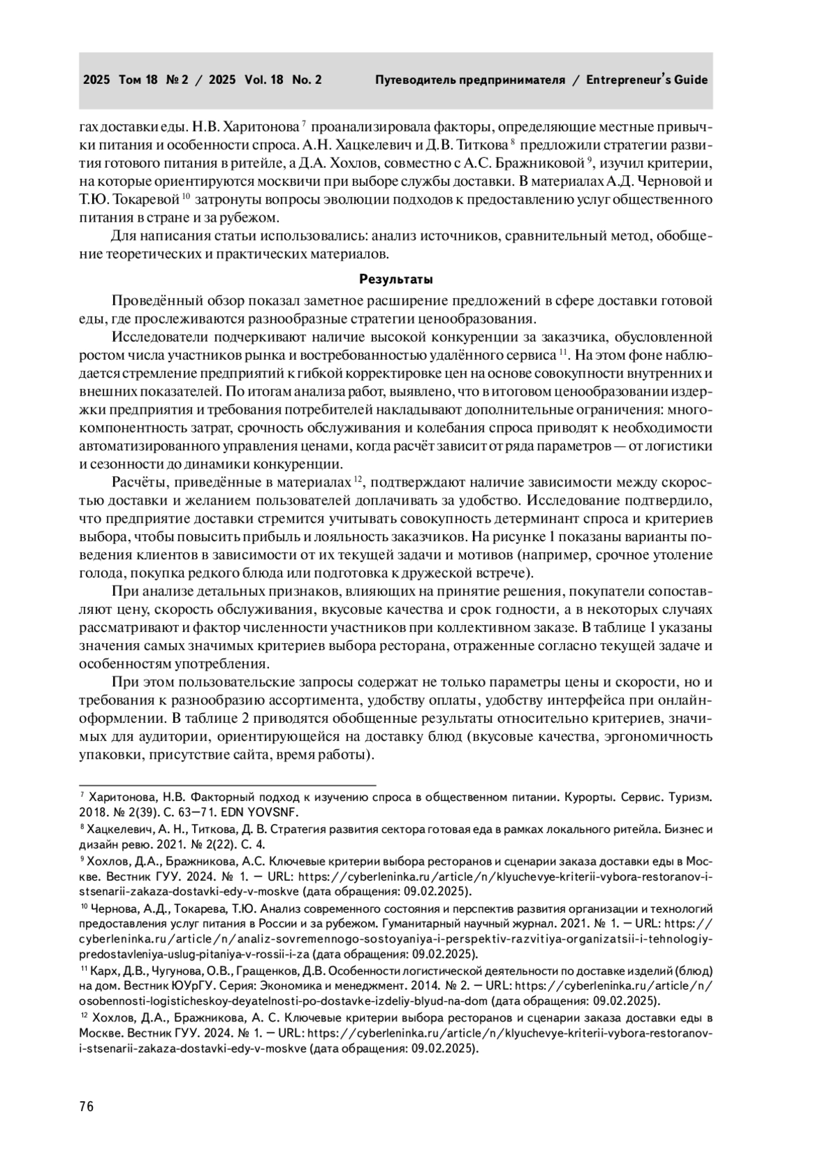 9. Хохлов, Д.А., Бражникова, А.С. Ключевые критерии выбора ресторанов и сценарии заказа доставки еды в Москве. Вестник ГУУ. 2024. № 1. - URL: https://cyberleninka.ru/article/n/klyuchevye-kriterii-vybora-restoranov-i-stsenarii-zakaza-dostavki-edy-v-moskve (дата обращения: 09. 02. 2025).