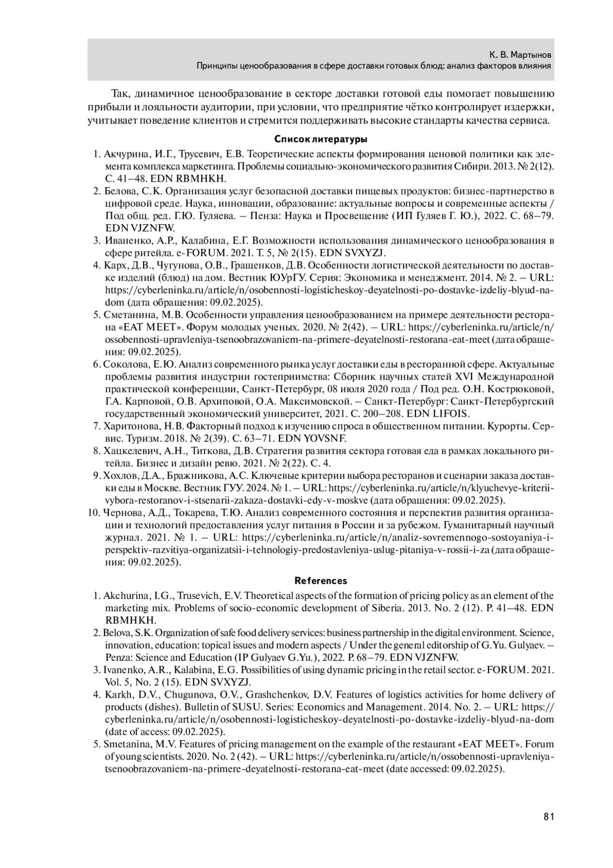 5. Сметанина, М.В. Особенности управления ценообразованием на примере деятельности ресторана «EAT MEET». Форум молодых ученых. 2020. № 2(42). - URL: https://cyberleninka.ru/article/n/ossobennosti-upravleniya-tsenoobrazovaniem-na-primere-deyatelnosti-restorana-eat-meet (дата обращения: 09. 02. 2025).