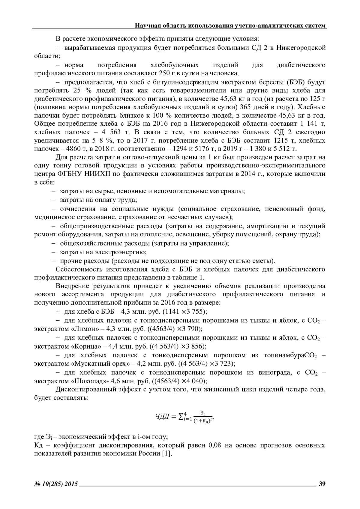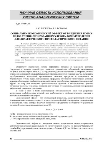 В статье приведены расчѐты экономического эффекта от внедрения новых видов хлебобулочных изделий для диабетического профилактического питания по Нижегородской области, себестоимости изготовления данных изделий. Авторы отмечают также и социальный эффект, заключающийся в повышении трудоспособности населения, сокращении выдачи листов по нетрудоспособности, профилактики заболеваний, связанных с недостаточным потреблением макро- и микронутриентов и повышение качества жизни больных сахарным диабетом второго типа.