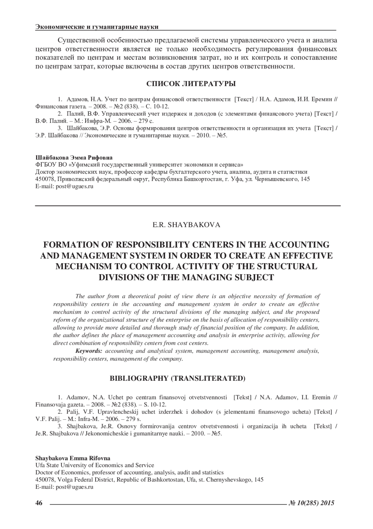 3. Шайбакова, Э.Р. Основы формирования центров ответственности и организация их учета [Текст] / Э.Р. Шайбакова // Экономические и гуманитарные науки. - 2010. - №5. EDN: MBGSVB