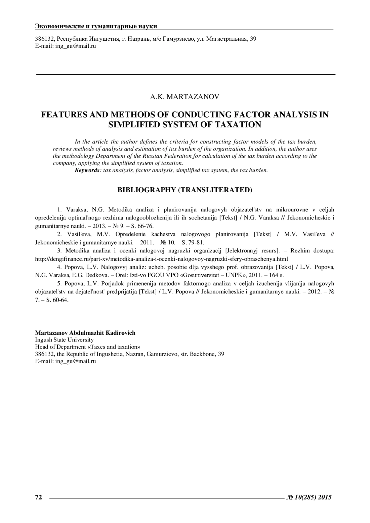 5. Попова, Л.В. Порядок применения методов факторного анализа в целях изучения влияния налоговых обязательств на деятельность предприятия [Текст] / Л.В. Попова // Экономические и гуманитарные науки. - 2012. - № 7. - С. 60-64. EDN: OZEHGX