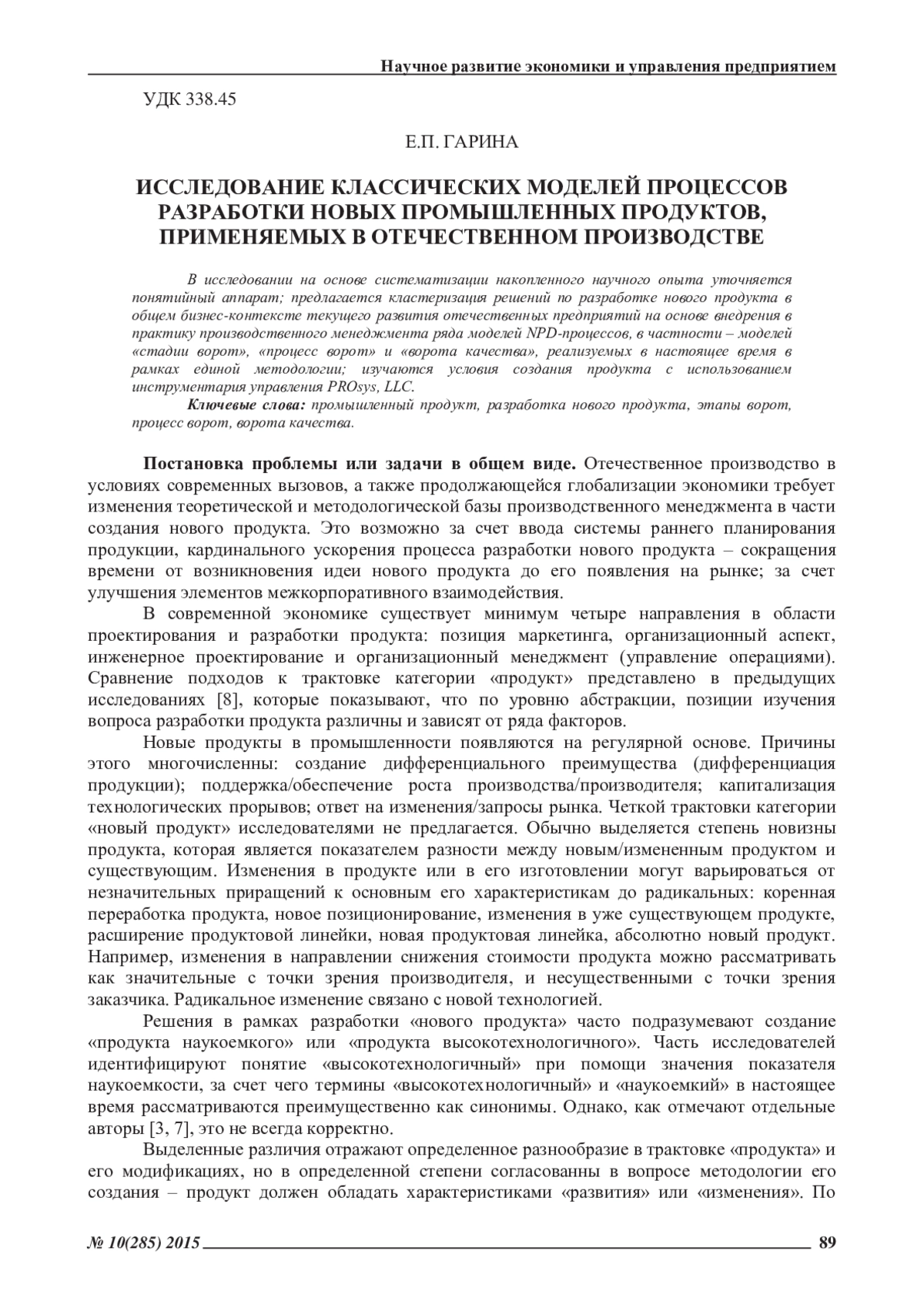 В исследовании на основе систематизации накопленного научного опыта уточняется понятийный аппарат; предлагается кластеризация решений по разработке нового продукта в общем бизнес-контексте текущего развития отечественных предприятий на основе внедрения в практику производственного менеджмента ряда моделей NPD-процессов, в частности – моделей «стадии ворот», «процесс ворот» и «ворота качества», реализуемых в настоящее время в рамках единой методологии; изучаются условия создания продукта с использованием инструментария управления PROsys, LLC