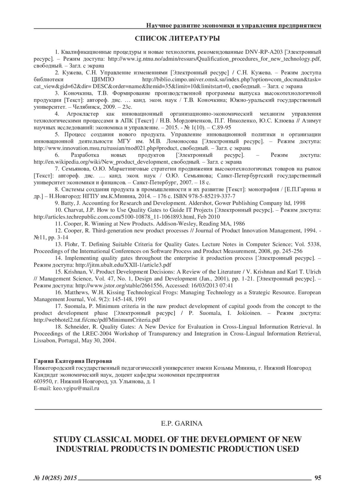 15. Krishnan, V. Product Development Decisions: A Review of the Literature / V. Krishnan and Karl T. Ulrich // Management Science, Vol. 47, No. 1, Design and Development (Jan., 2001), pp. 1-21. [Электронный ресурс]. - Режим доступа: http://www.jstor.org/stable/2661556, Accessed: 16/03/2013 07:41.