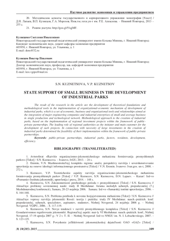 16. Кузнецова, С.Н. Промышленные парки как механизм повышения эффективности малых и средних производств [Текст] / С.Н. Кузнецова // Образование и наука в XXI веке - 2012: VIII Международная научно - практическая конференция, Белград, 17-25 октября 2012. Том 7. Экономика. София: «Бял ГРАД - БГ» ООД - С.40-44.