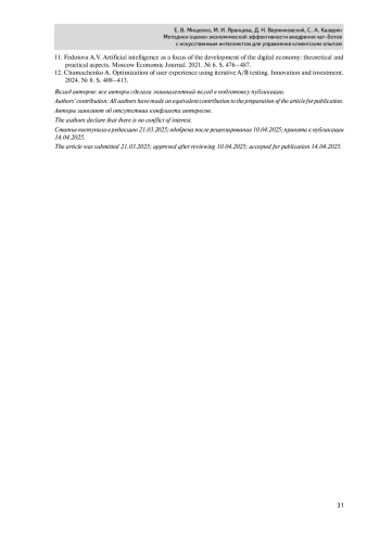 6. Мартынов И.А., Пестун У.А., Ешкина О.И. A/B тестирование как метод управления рисками реализации инновационных проектов. Естественно-гуманитарные исследования. 2024. № 5 (55). С. 569-572.