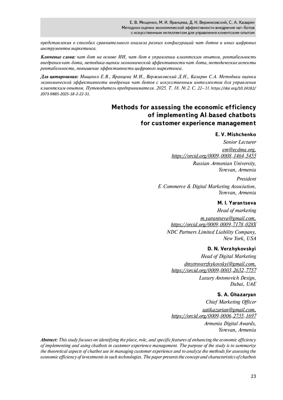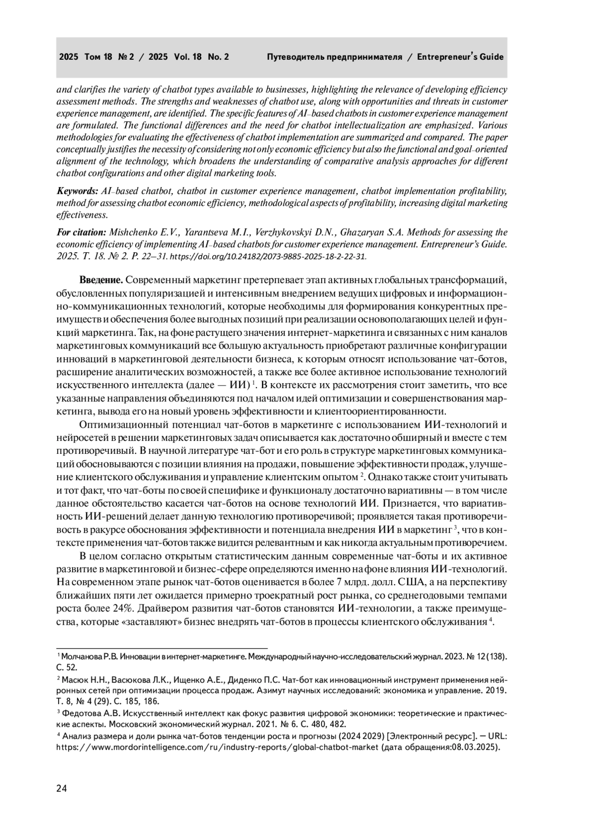 Цель исследования — обобщить теоретические аспекты применения чат–ботов в управлении клиентским опытом и методики оценки экономической эффективности инвестиций в них.
