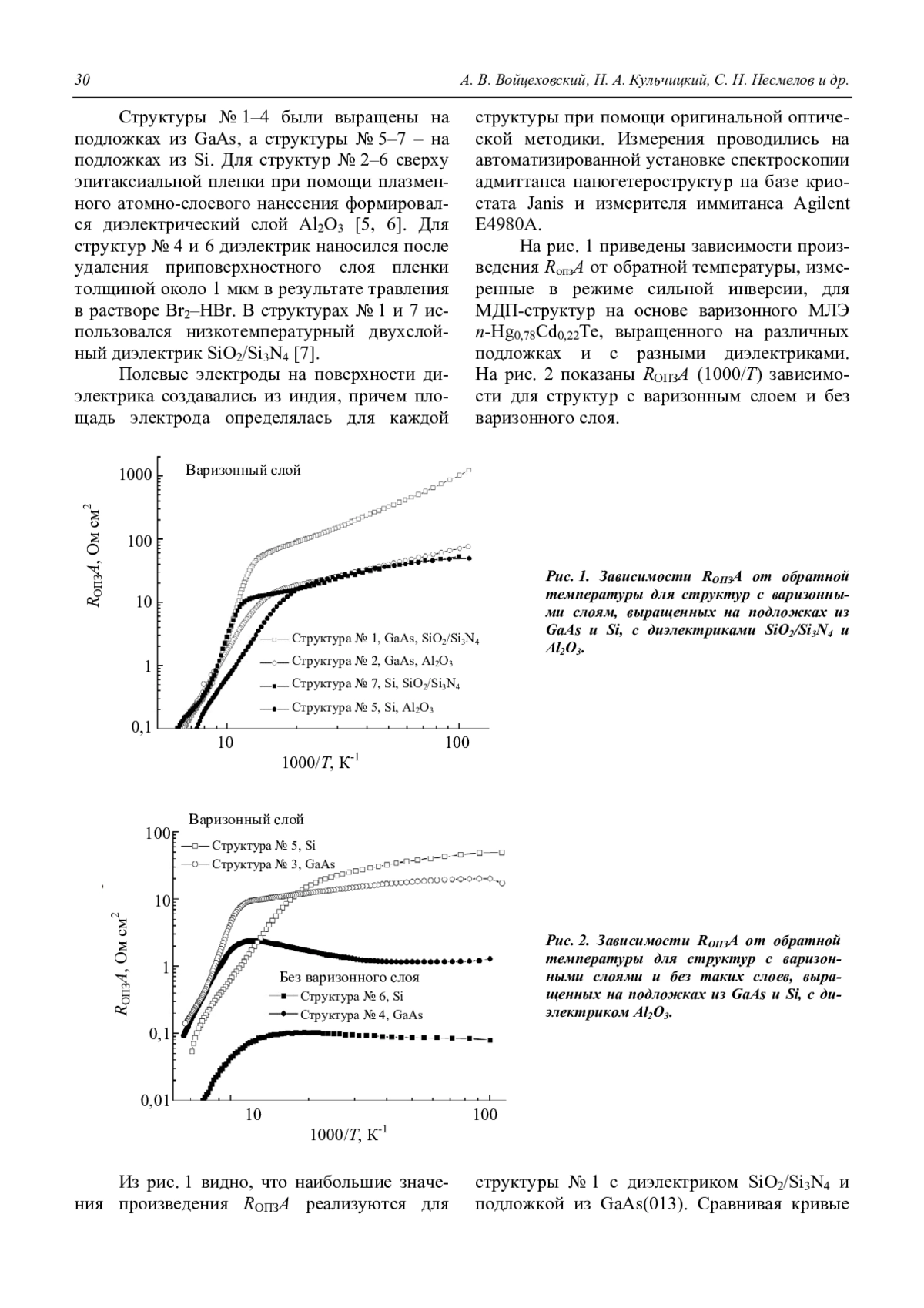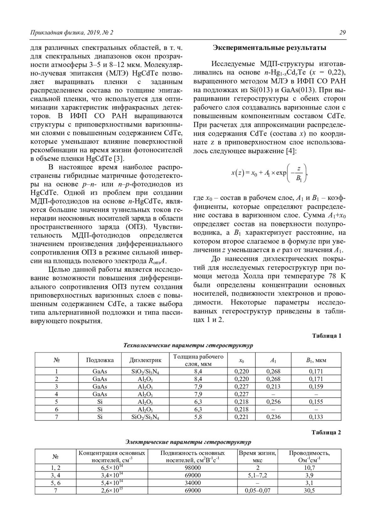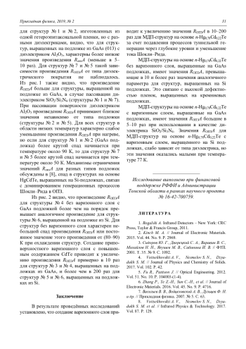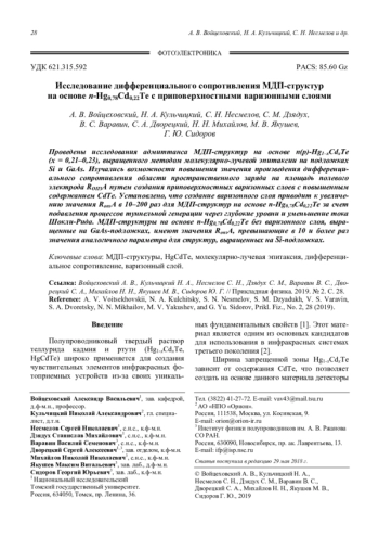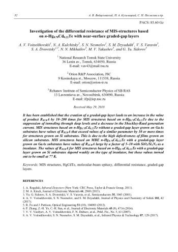 Проведены исследования адмиттанса МДП-структур на основе n(p)-Hg1–xCdxTe (x = 0,21–0,23), выращенного методом молекулярно-лучевой эпитаксии на подложках Si и GaAs. Изучались возможности повышения значения произведения дифференциального сопротивления области пространственного заряда на площадь полевого электрода RОПЗA путем создания приповерхностных варизонных слоев с повышенным содержанием CdTe. Установлено, что создание варизонного слоя приводит к увеличению значения RопзA в 10–200 раз для МДП-структур на основе n-Hg0,78Cd0,22Te за счет подавления процессов туннельной генерации через глубокие уровни и уменьшение тока Шокли-Рида. МДП-структуры на основе n-Hg0,78Cd0,22Te без варизонного слоя, выращенные на GaAs-подложках, имеют значения RопзA, превышающие в 10 и более раз значения аналогичного параметра для структур, выращенных на Si-подложках.