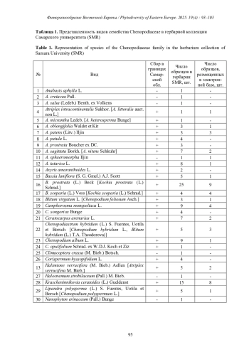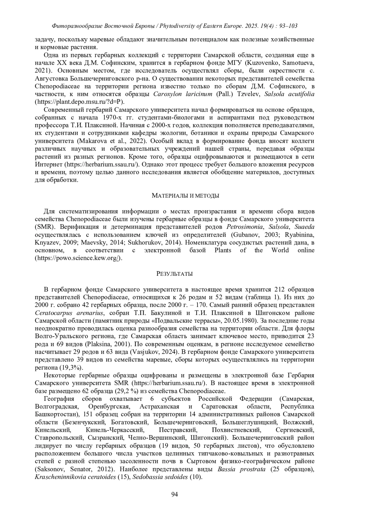 Одна из первых гербарных коллекций с территории Самарской области, созданная еще в начале ХХ века Д. М. Софинским, хранится в гербарном фонде МГУ (Kuzovenko, Samotueva, 2021). Основным местом, где исследователь осуществлял сборы, были окрестности с. Августовка Большечерниговского р-на. О существовании некоторых представителей семейства Chenopodiaceae на территории региона известно только по сборам Д. М. Софинского, в частности, к ним относятся образцы Caroxylon laricinum (Pall.) Tzvelev, Salsola acutifolia (https://plant. depo. msu. ru/? d=P). Современный гербарий Самарского университета начал формироваться на основе образцов, собранных с начала 1970-х гг. студентами-биологами и аспирантами под руководством профессора Т. И. Плаксиной. Начиная с 2000-х годов, коллекция пополняется преподавателями, их студентами и сотрудниками кафедры экологии, ботаники и охраны природы Самарского университета (Makarova et al., 2022). Особый вклад в формирование фонда вносят коллеги различных научных и образовательных учреждений нашей страны, передавая образцы растений из разных регионов. Кроме того, образцы оцифровываются и размещаются в сети Интернет (https://herbarium. ssau. ru/). Однако этот процесс требует большого вложения ресурсов и времени, поэтому целью данного исследования является обобщение материалов, доступных для обработки.