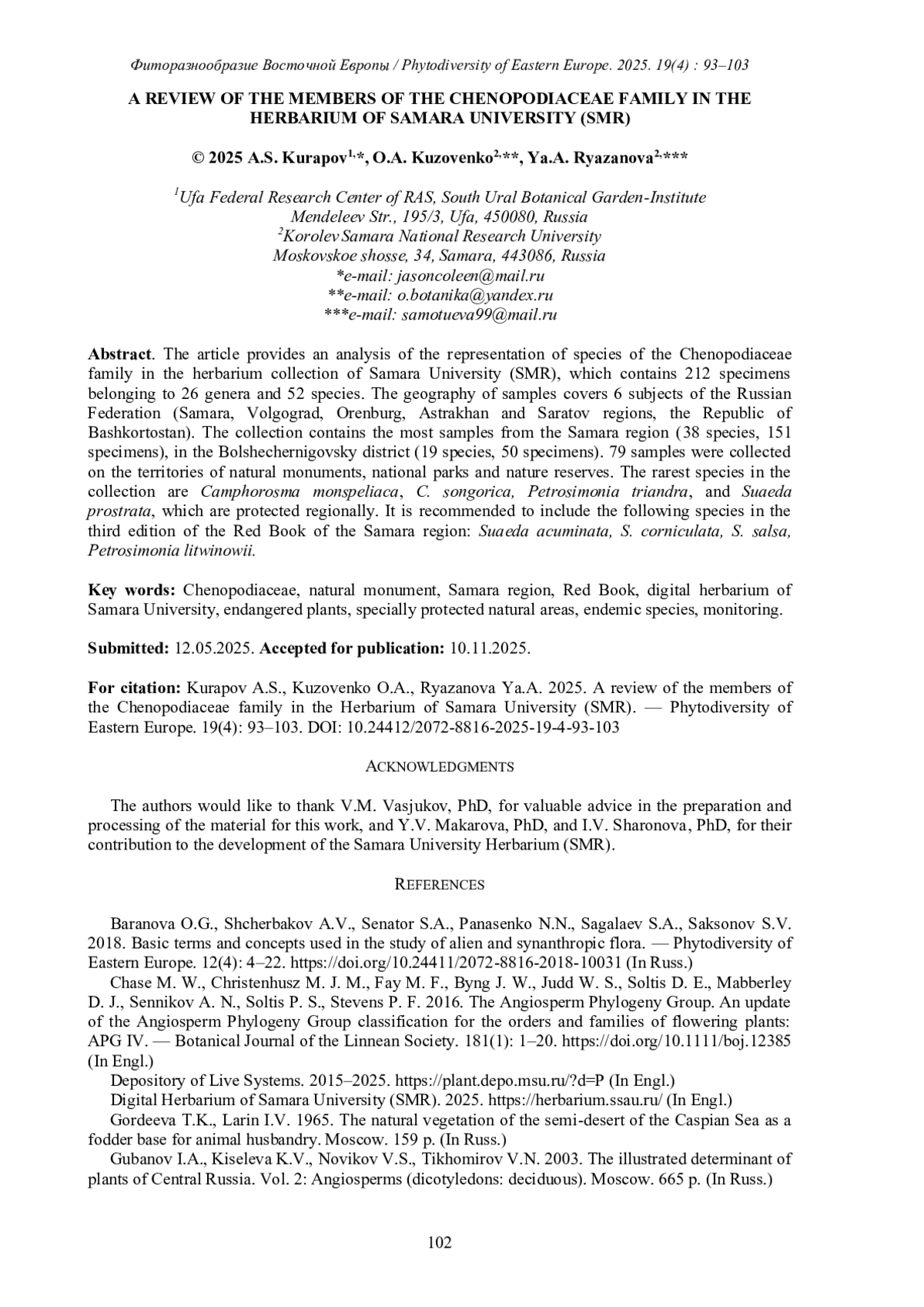 12. [Kuzovenko, Samotueva] Кузовенко О.А., Самотуева Я.А. 2021. Мониторинг раритетного компонента флоры степей Самарской области с использованием цифрового гербария МГУ. - В кн.: Материалы заоч. конф. Саяно-Шушенского биосферного заповедника “Мониторинг состояния природных комплексов и многолетние исследования на особо охраняемых природных территориях”. Шушенское. С. 127-132.