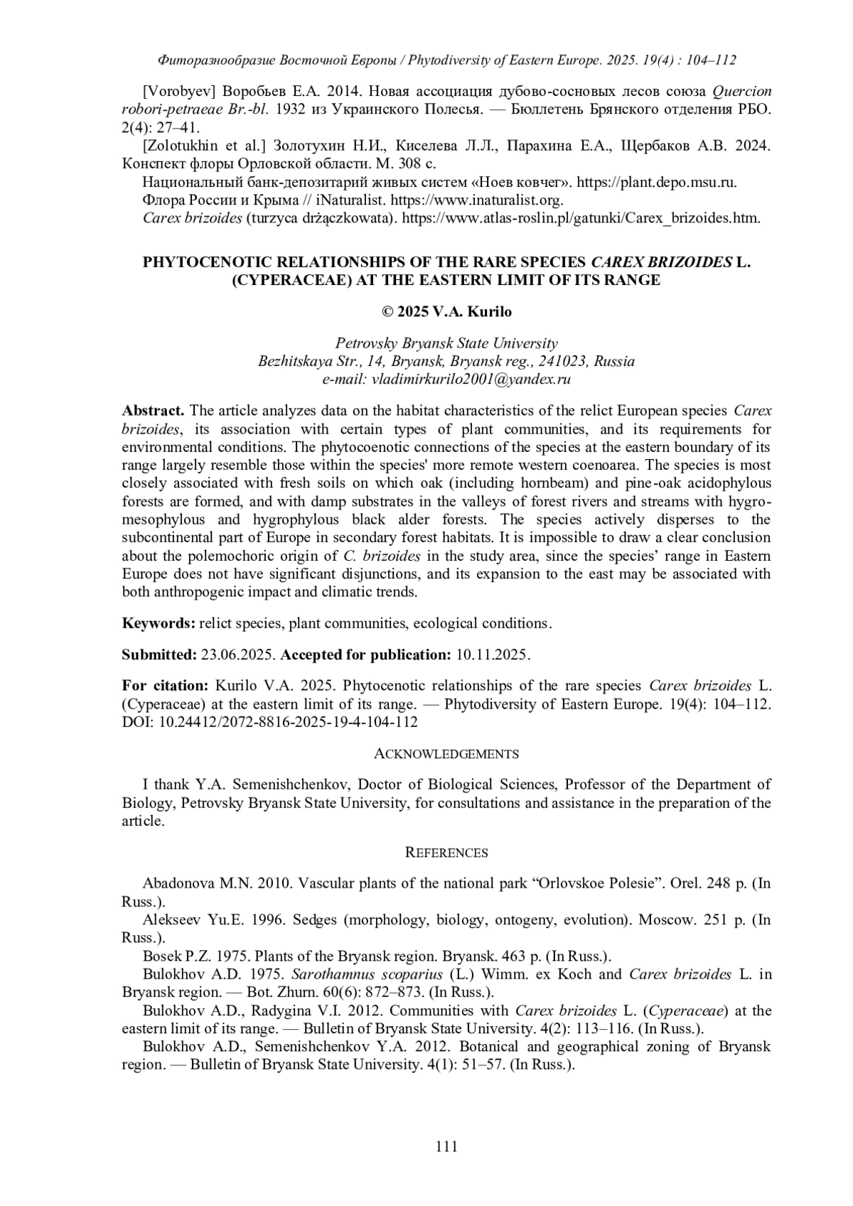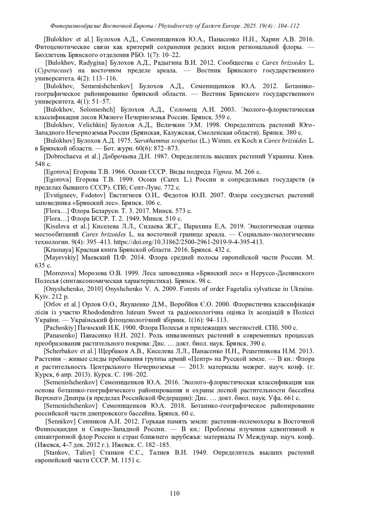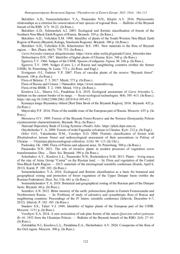 5. [Bulokhov et al.] Булохов А.Д., Семенищенков Ю.А., Панасенко Н.Н., Харин А.В. 2016. Фитоценотические связи как критерий сохранения редких видов региональной флоры. - Бюллетень Брянского отделения РБО. 1(7): 10-22.