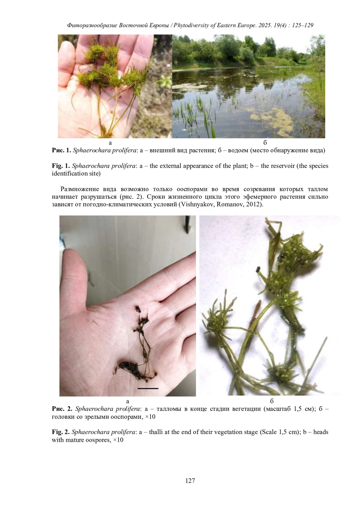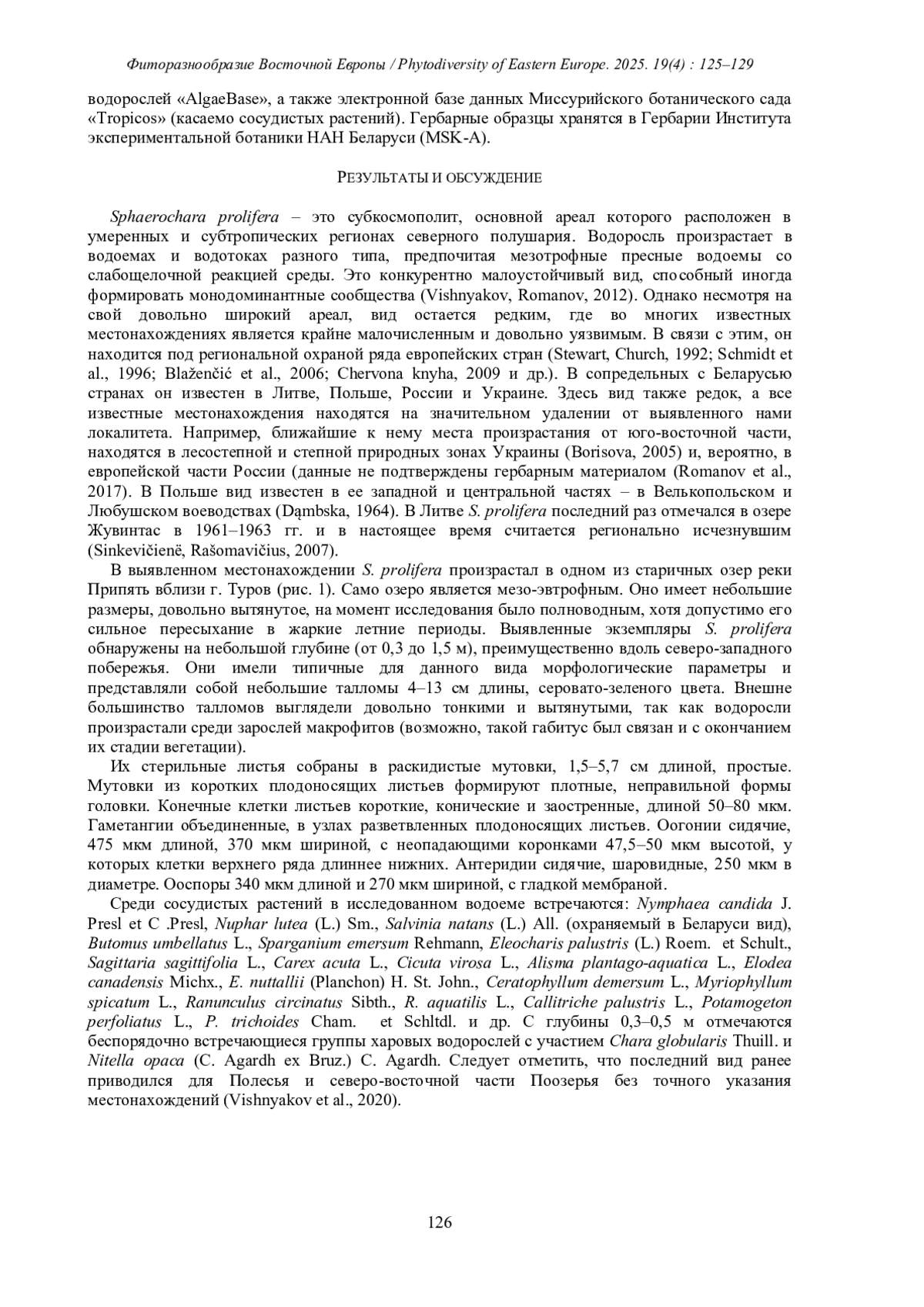 Sphaerochara prolifera – это субкосмополит, основной ареал которого расположен в умеренных и субтропических регионах северного полушария. Водоросль произрастает в водоемах и водотоках разного типа, предпочитая мезотрофные пресные водоемы со слабощелочной реакцией среды. Это конкурентно малоустойчивый вид, способный иногда формировать монодоминантные сообщества (Vishnyakov, Romanov, 2012). Однако несмотря на свой довольно широкий ареал, вид остается редким, где во многих известных местонахождениях является крайне малочисленным и довольно уязвимым. В связи с этим, он находится под региональной охраной ряда европейских стран (Stewart, Church, 1992; Schmidt et al., 1996; Blaženčić et al., 2006; Chervona knyha, 2009 и др.). В сопредельных с Беларусью странах он известен в Литве, Польше, России и Украине. Здесь вид также редок, а все известные местонахождения находятся на значительном удалении от выявленного нами локалитета. Например, ближайшие к нему места произрастания от юго-восточной части, находятся в лесостепной и степной природных зонах Украины (Borisova, 2005) и, вероятно, в европейской части России (данные не подтверждены гербарным материалом (Romanov et al., 2017). В Польше вид известен в ее западной и центральной частях – в Велькопольском и Любушском воеводствах (Dąmbska, 1964). В Литве S. prolifera последний раз отмечался в озере Жувинтас в 1961–1963 гг. и в настоящее время считается регионально исчезнувшим (Sinkevičienë, Rašomavičius, 2007).