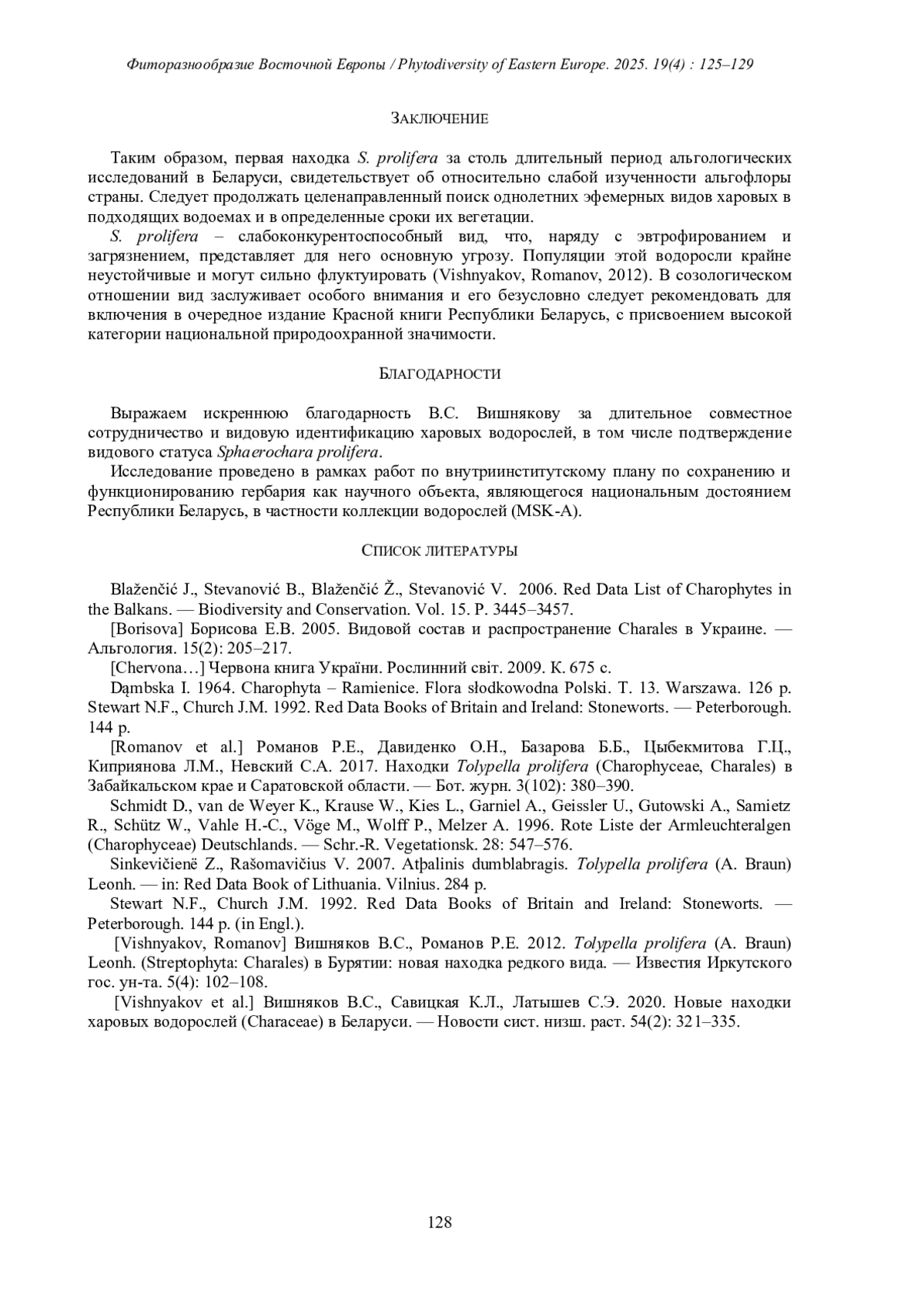 1. Blaženčić J., Stevanović B., Blaženčić Ž., Stevanović V. 2006. Red Data List of Charophytes in the Balkans. - Biodiversity and Conservation. Vol. 15. P. 3445-3457. EDN: PAQCGV