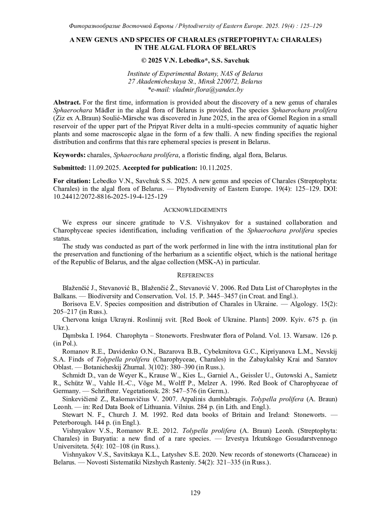 11. [Vishnyakov et al.] Вишняков В.С., Савицкая К.Л., Латышев С.Э. 2020. Новые находки харовых водорослей (Characeae) в Беларуси. - Новости сист. низш. раст. 54(2): 321-335.