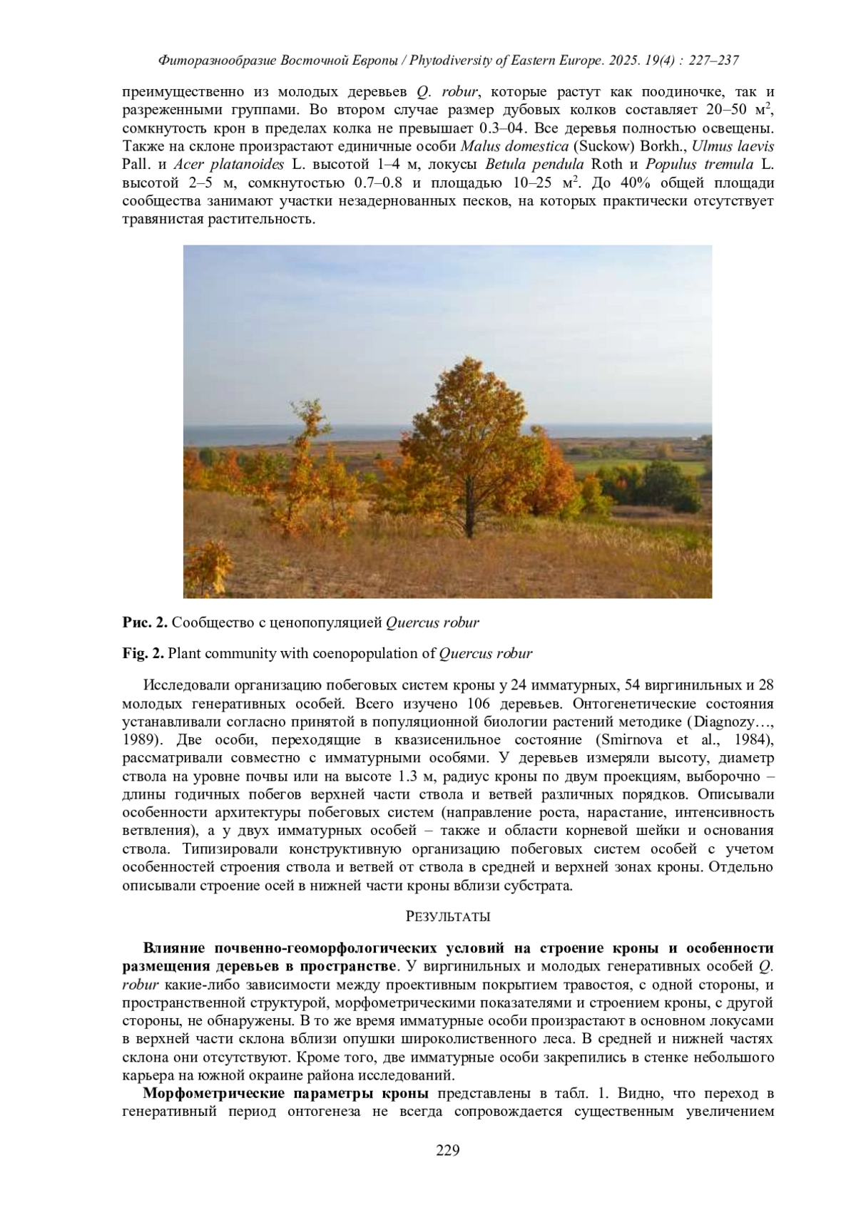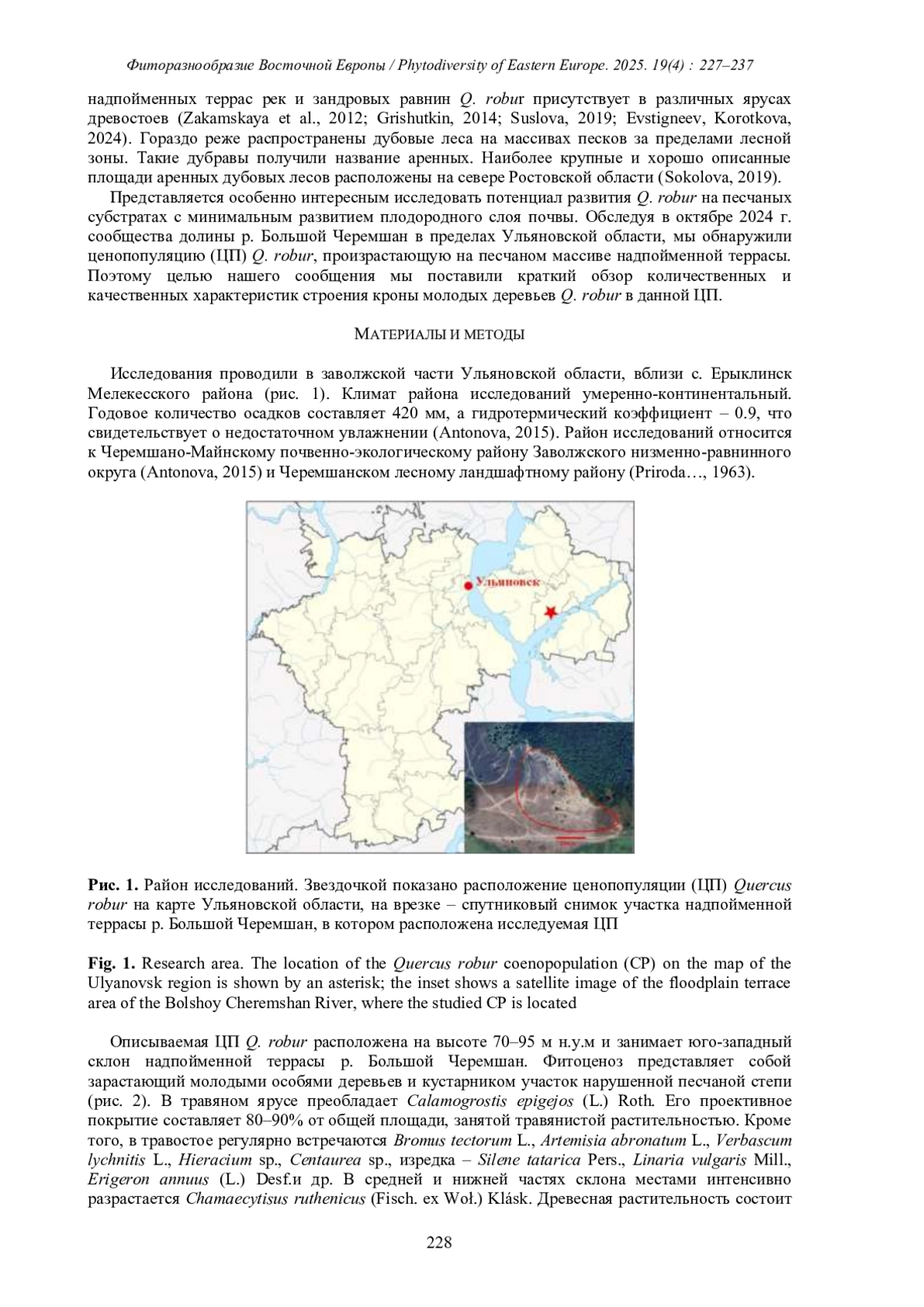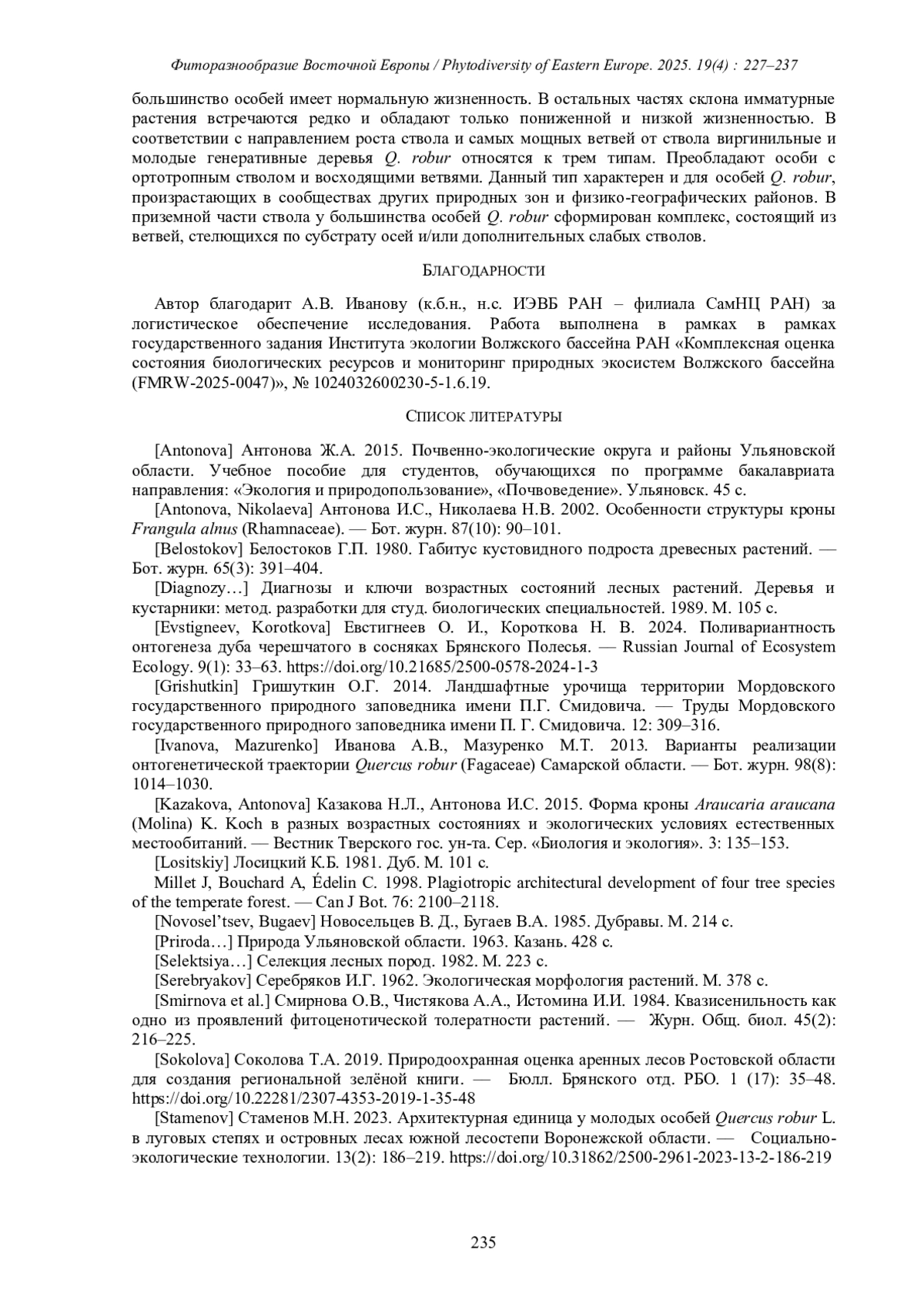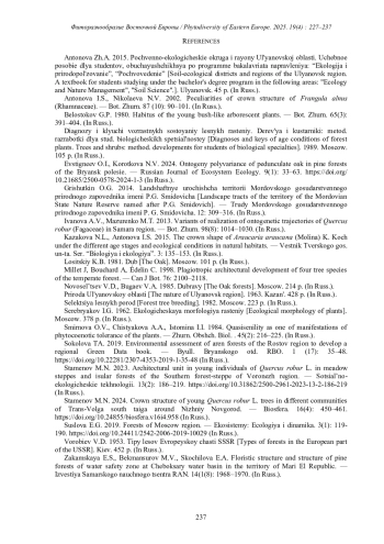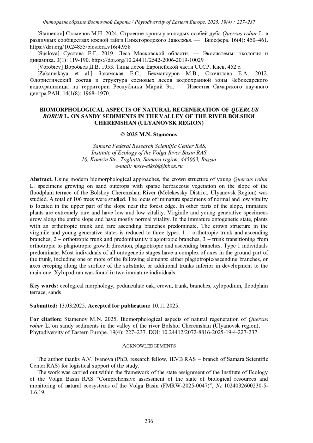 СТАМЕНОВ М. Н. БИОМОРФОЛОГИЧЕСКИЕ АСПЕКТЫ ЕСТЕСТВЕННОГО ВОЗОБНОВЛЕНИЯ QUERCUS ROBUR L. НА ПЕСЧАНЫХ ОТЛОЖЕНИЯХ В ДОЛИНЕ Р. БОЛЬШОЙ ЧЕРЕМШАН (УЛЬЯНОВСКАЯ ОБЛАСТЬ) // ФИТОРАЗНООБРАЗИЕ ВОСТОЧНОЙ ЕВРОПЫ. 2025. Т. 19 № 4