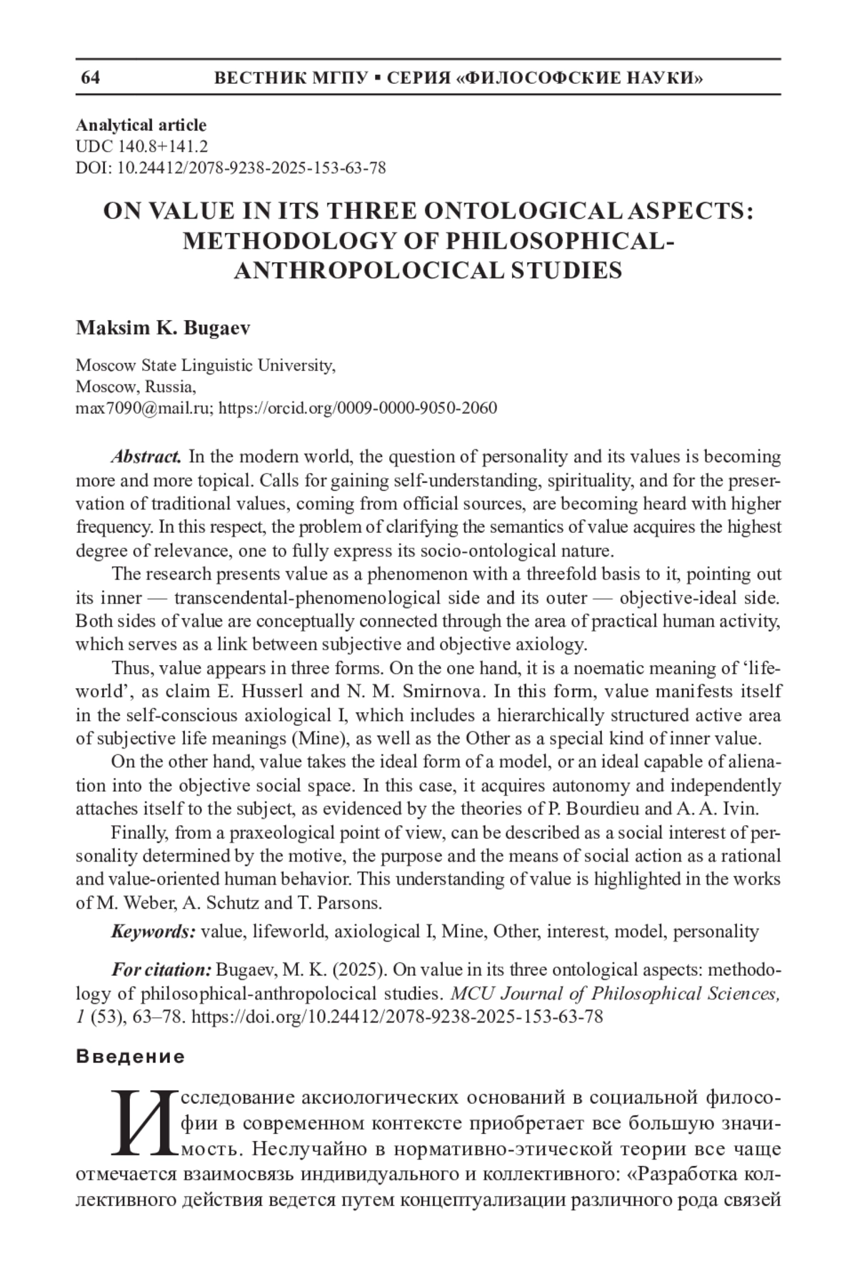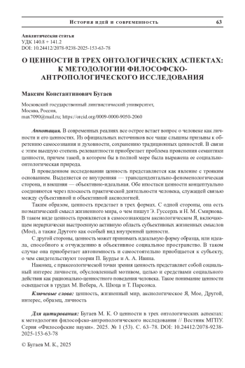 БУГАЕВ М. К. О ЦЕННОСТЯХ В ТРЕХОНТОЛОГИЧЕСКИХ АСПЕКТАХ: К МЕТОДОЛОГИИ ФИЛОСОФСКО-АНТРОПОЛОГИЧЕСКОГО ИССЛЕДОВАНИЯ // ВЕСТНИК МГПУ. СЕРИЯ: ФИЛОСОФСКИЕ НАУКИ. 2025. № 1 (53)