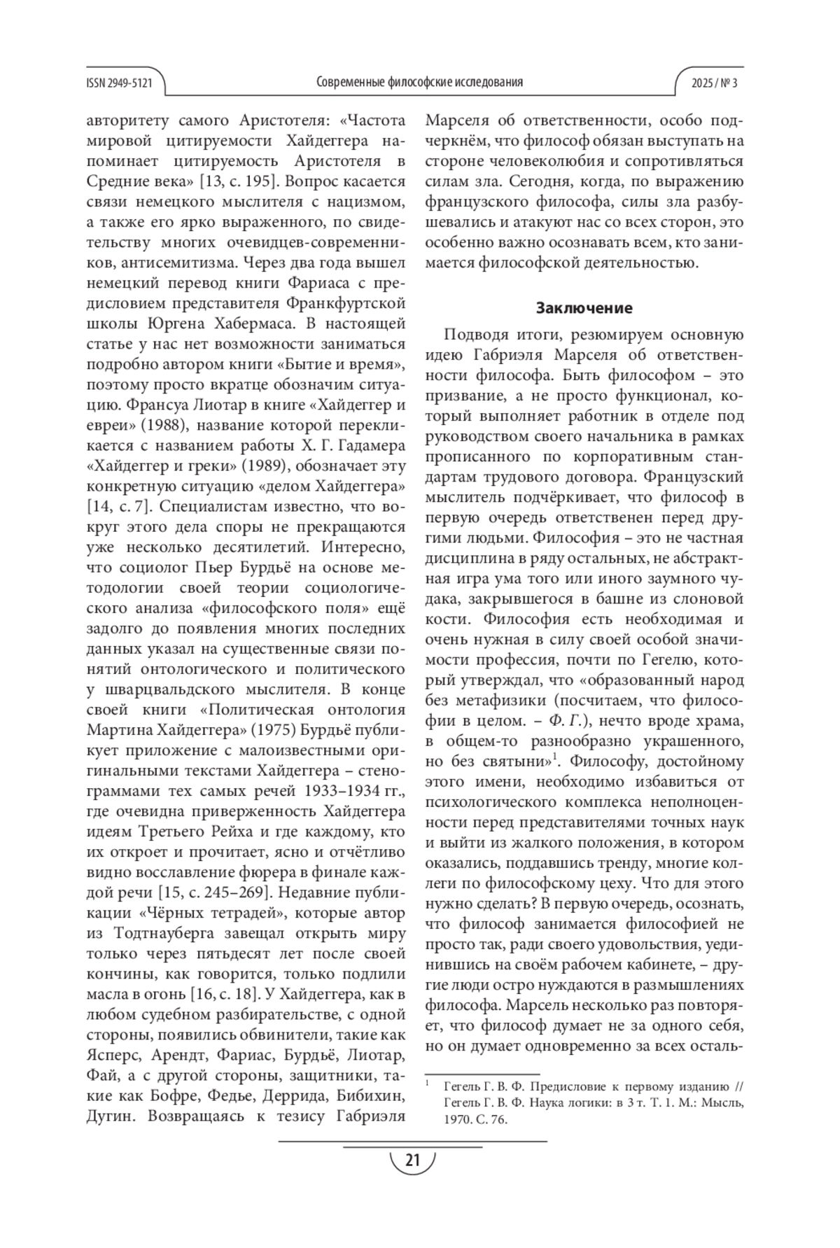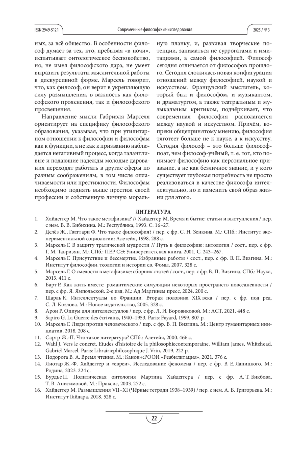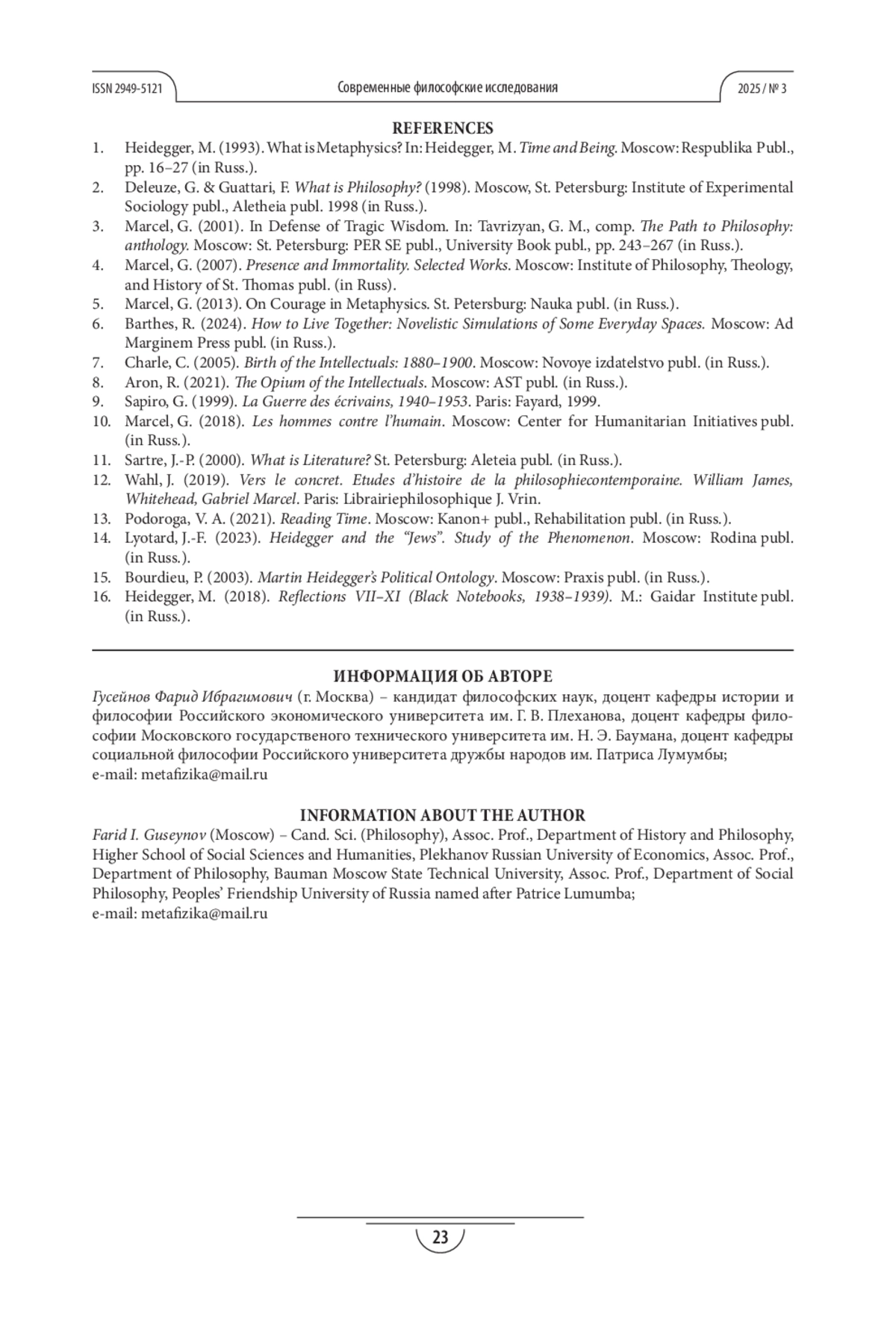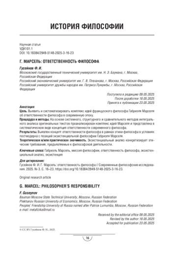 ГУСЕЙНОВ Ф. И. Г. МАРСЕЛЬ: ОТВЕТСТВЕННОСТЬ ФИЛОСОФА // СОВРЕМЕННЫЕ ФИЛОСОФСКИЕ ИССЛЕДОВАНИЯ. 2025. № 3