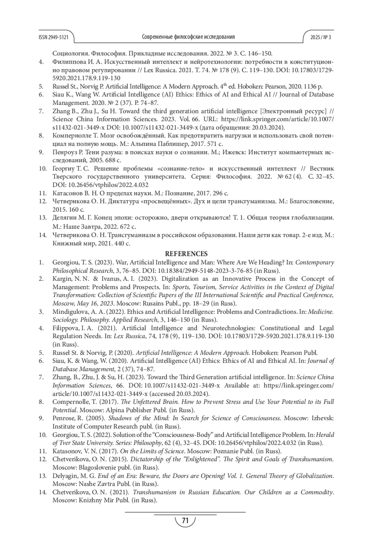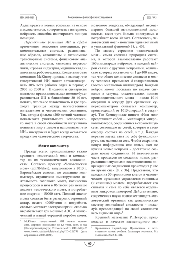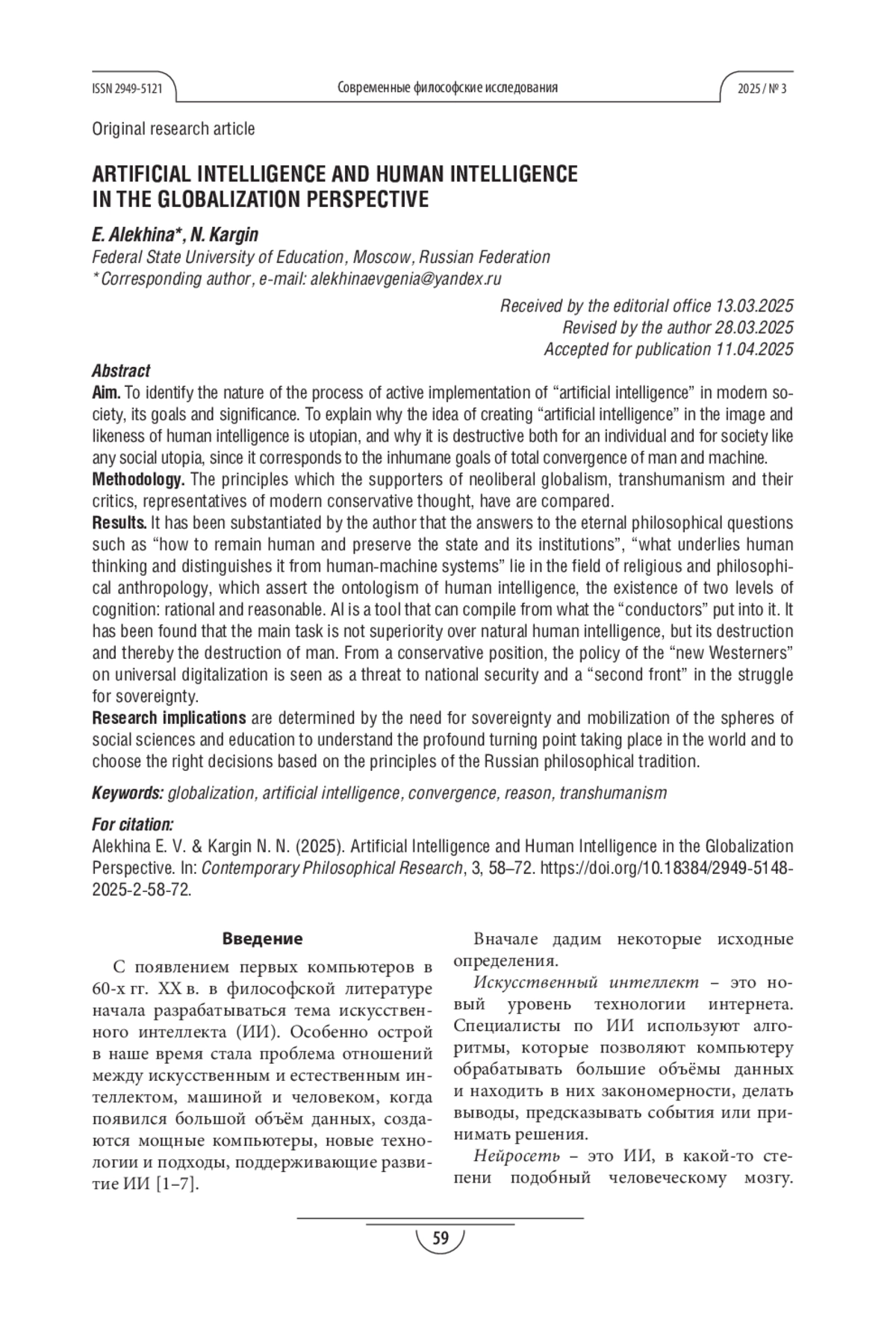 АЛЁХИНА Е. В., КАРГИН Н. Н. ИСКУССТВЕННЫЙ ИНТЕЛЛЕКТ И ЧЕЛОВЕЧЕСКИЙ РАЗУМ В ПЕРСПЕКТИВЕ ГЛОБАЛИЗАЦИИ // СОВРЕМЕННЫЕ ФИЛОСОФСКИЕ ИССЛЕДОВАНИЯ. 2025. № 3