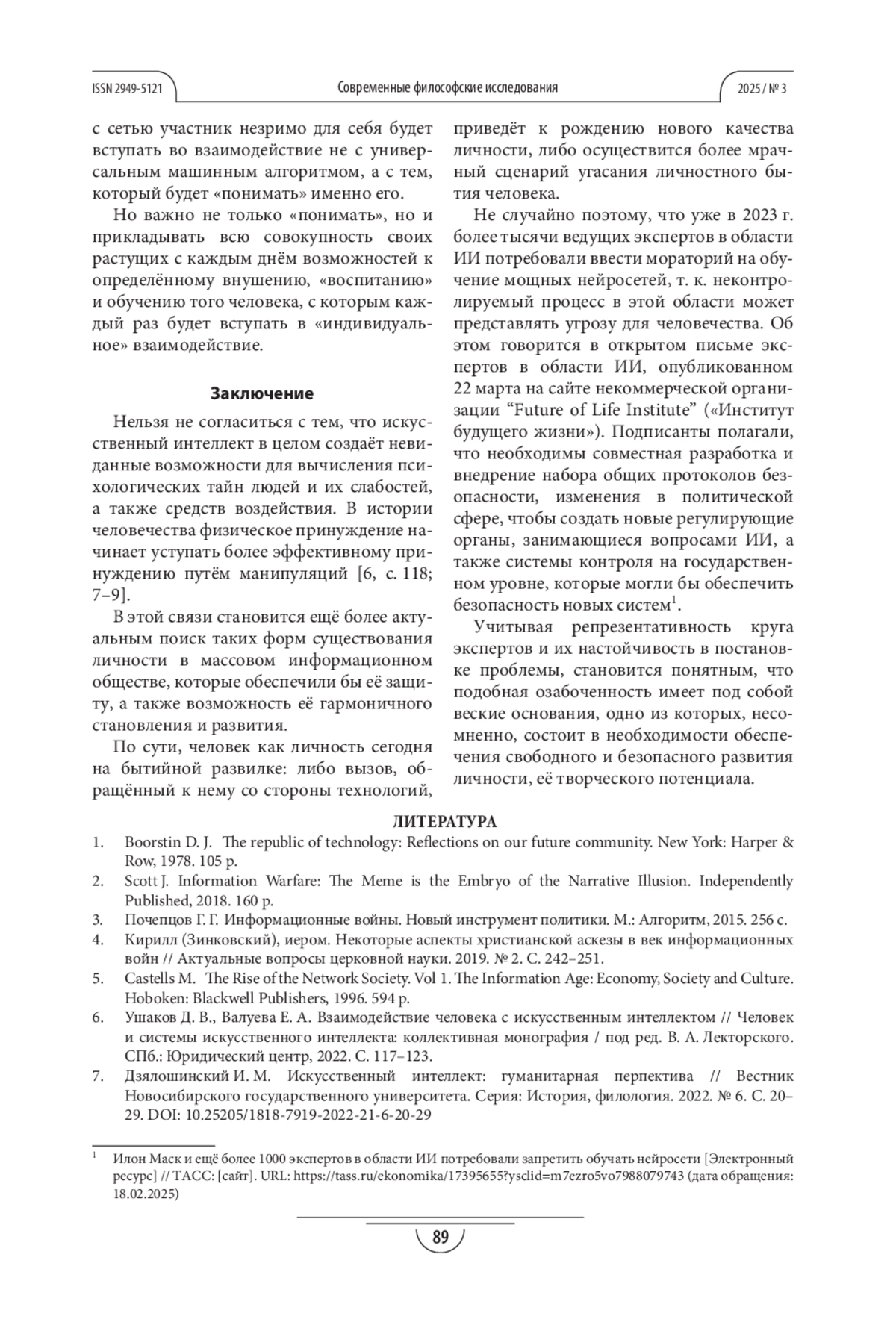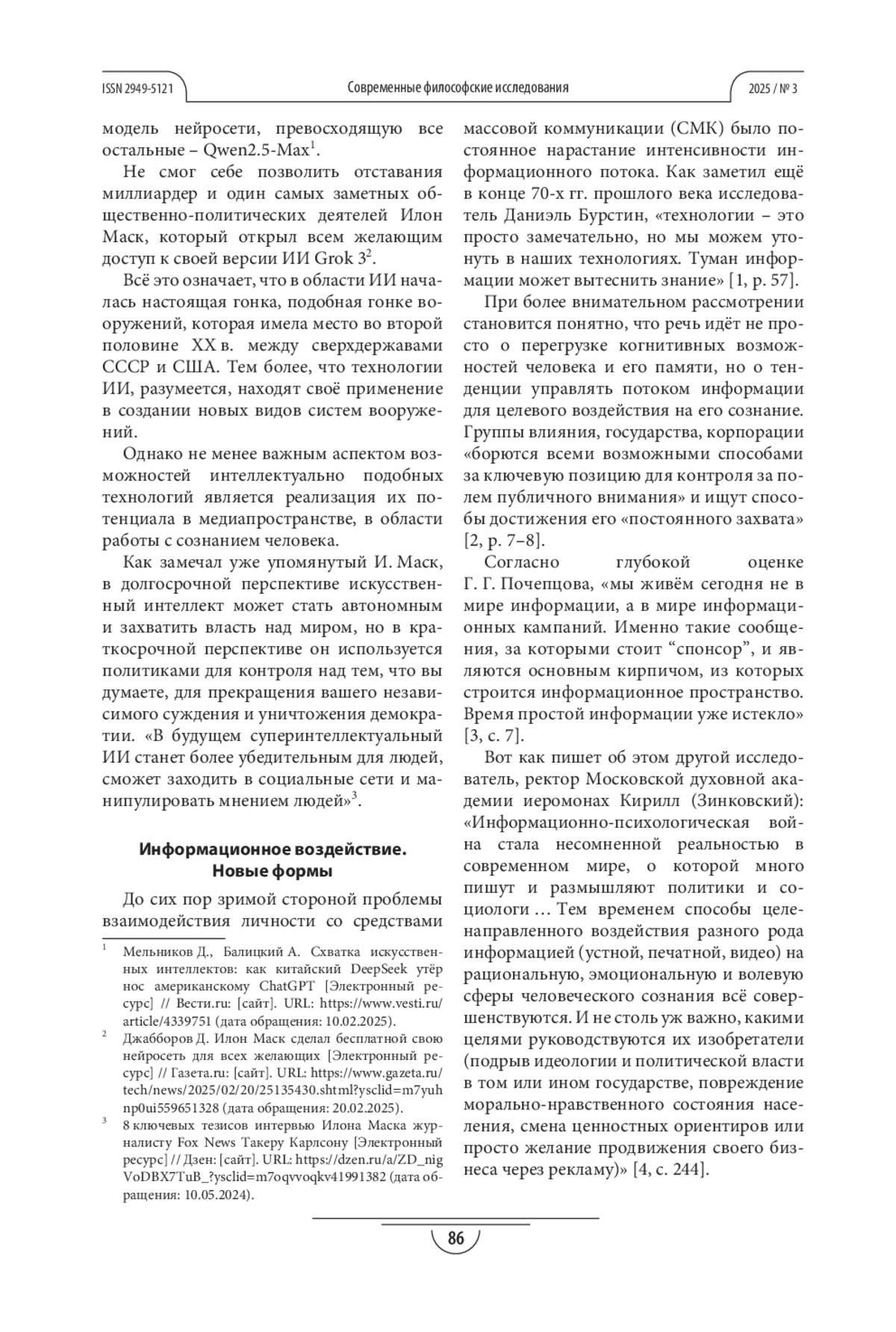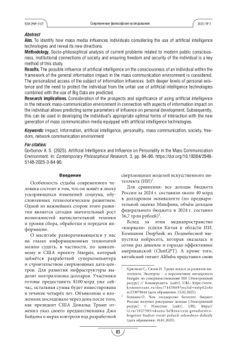 ГОРБУНОВ А. С. ИСКУССТВЕННЫЙ ИНТЕЛЛЕКТ И ВЛИЯНИЕ НА ЛИЧНОСТЬ В СРЕДЕ МАССОВОЙ КОММУНИКАЦИИ // СОВРЕМЕННЫЕ ФИЛОСОФСКИЕ ИССЛЕДОВАНИЯ. 2025. № 3
