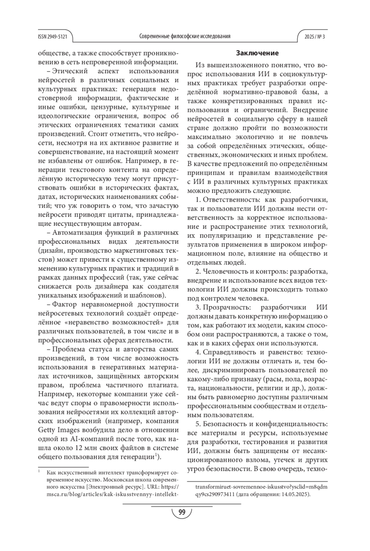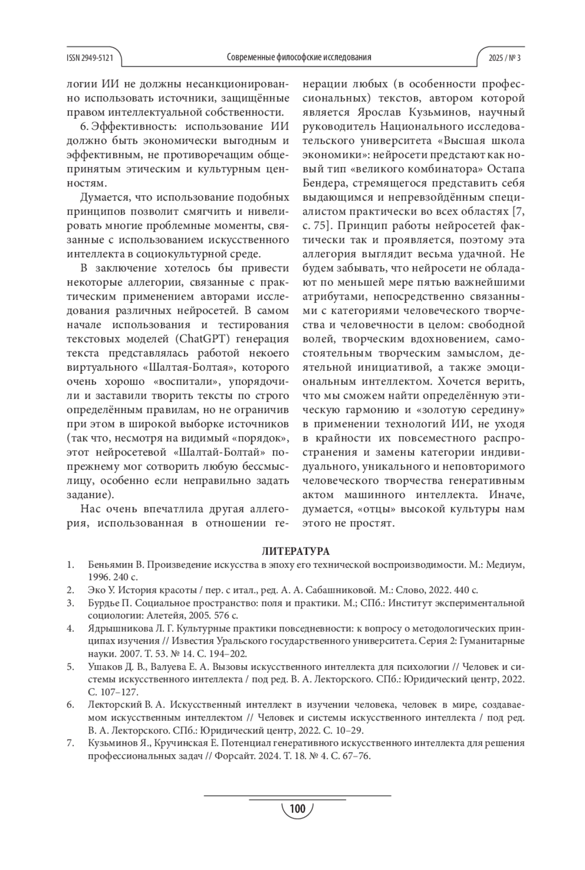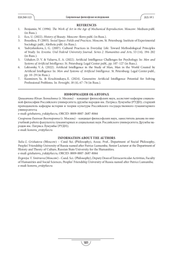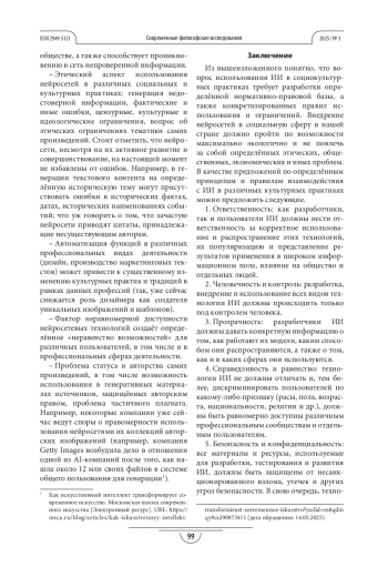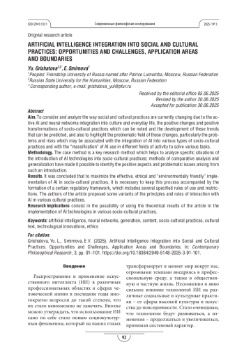ГРИШАТОВА Ю. Л., СМИРНОВА Е. В. ВНЕДРЕНИЕ ИСКУССТВЕННОГО ИНТЕЛЛЕКТА В СОЦИАЛЬНЫЕ И КУЛЬТУРНЫЕ ПРАКТИКИ: ВОЗМОЖНОСТИ И ПРОБЛЕМЫ, СФЕРЫ И ГРАНИЦЫ ПРИМЕНЕНИЯ // СОВРЕМЕННЫЕ ФИЛОСОФСКИЕ ИССЛЕДОВАНИЯ. 2025. № 3