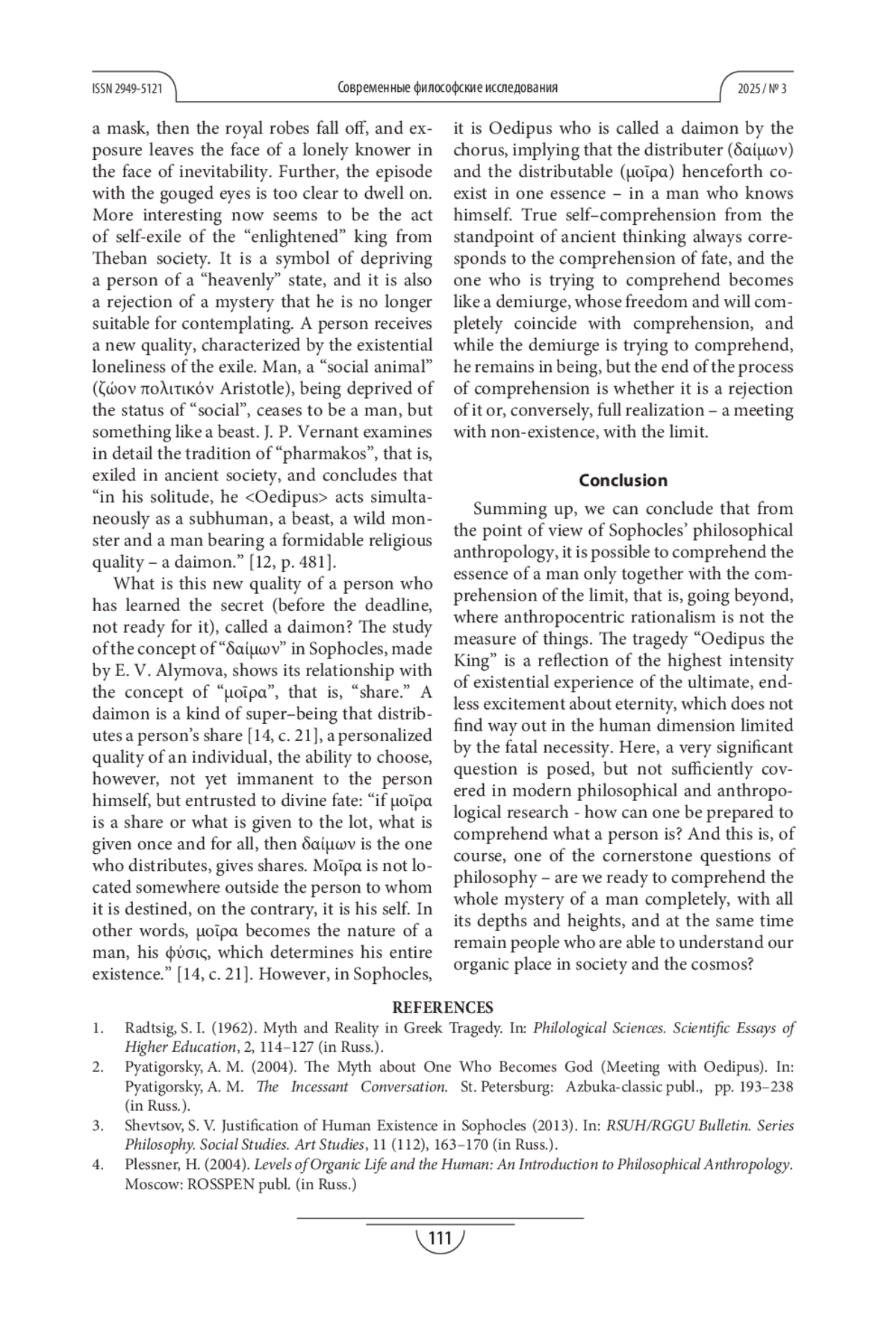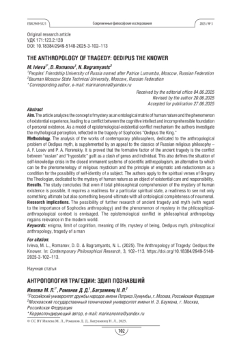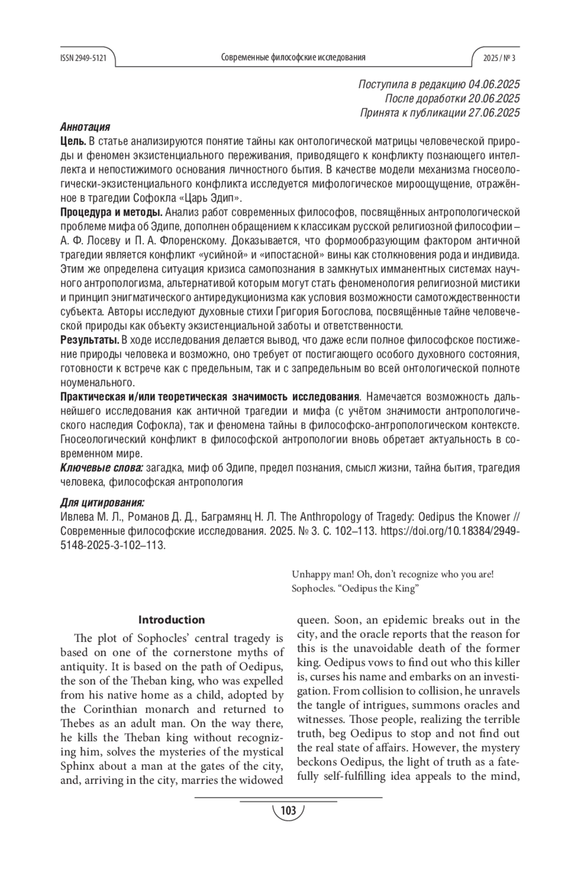 ИВЛЕВА М. Л., РОМАНОВ Д. Д., БАГРАМЯНЦ Н. Л. THE ANTHROPOLOGY OF TRAGEDY: OEDIPUS THE KNOWER // СОВРЕМЕННЫЕ ФИЛОСОФСКИЕ ИССЛЕДОВАНИЯ. 2025. № 3