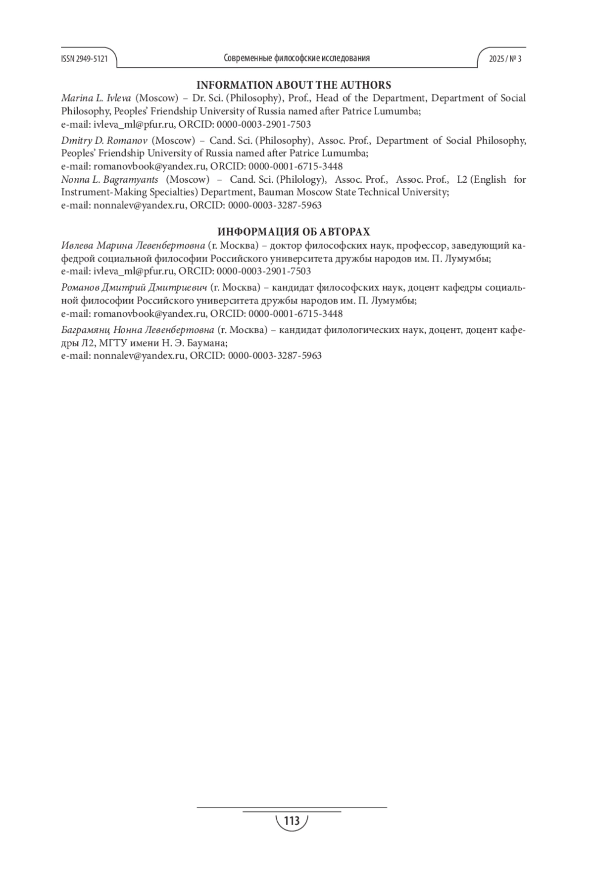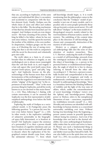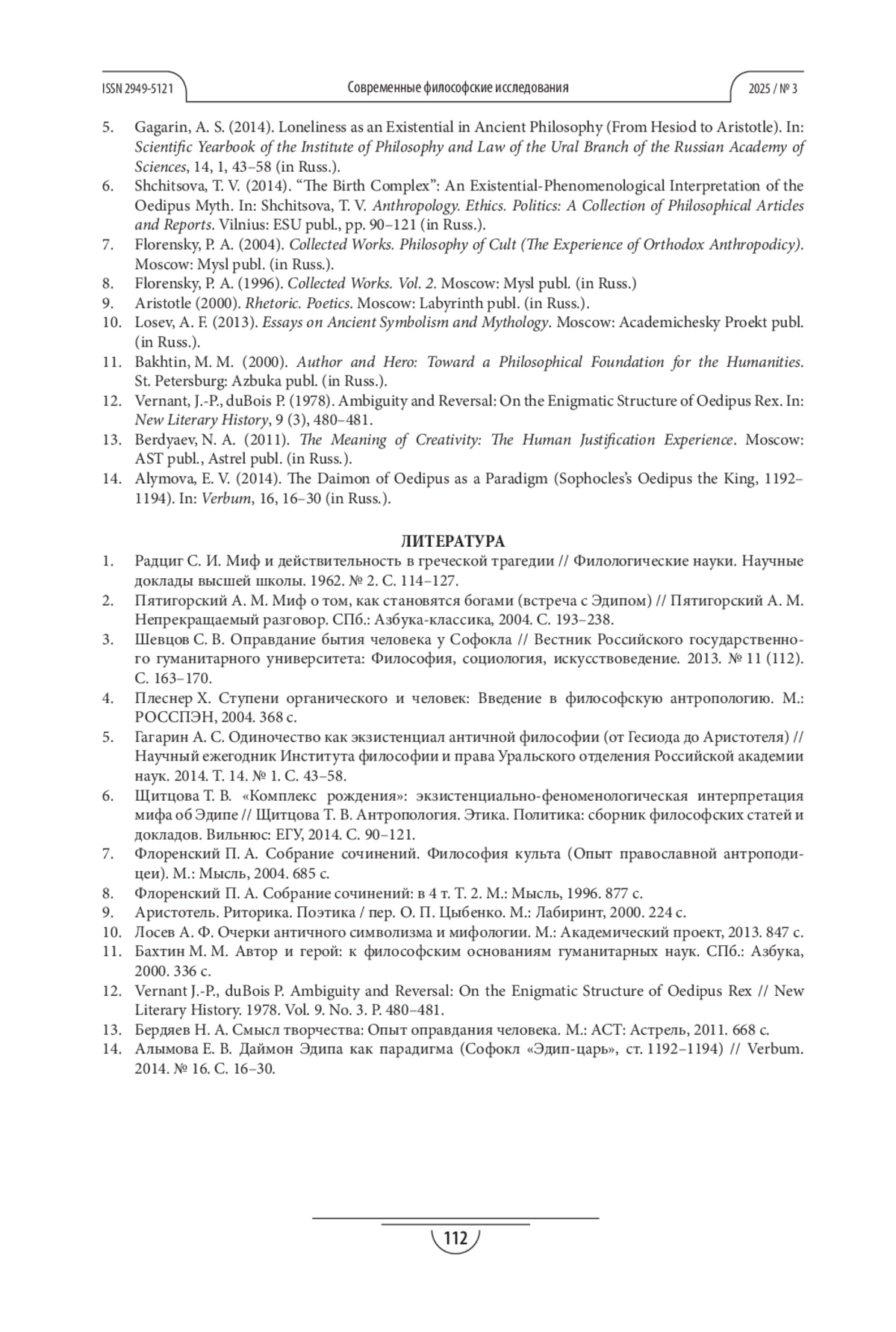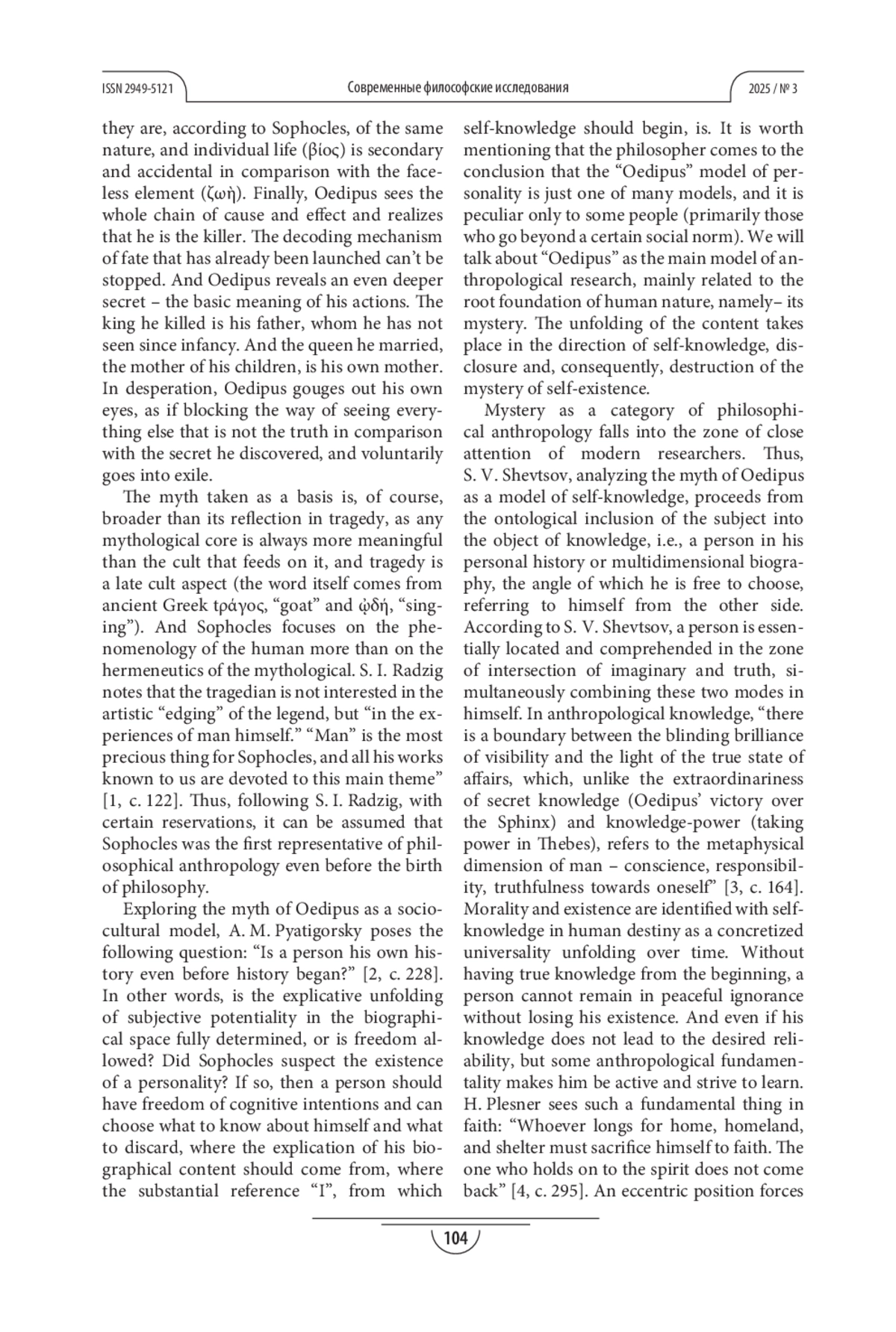 ИВЛЕВА М. Л., РОМАНОВ Д. Д., БАГРАМЯНЦ Н. Л. THE ANTHROPOLOGY OF TRAGEDY: OEDIPUS THE KNOWER // СОВРЕМЕННЫЕ ФИЛОСОФСКИЕ ИССЛЕДОВАНИЯ. 2025. № 3