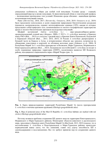 Изучена онтогенетическая структура 10 ценопопуляций (ЦП) Salvia verticillata, произрастающих в Республике Марий Эл (РМЭ). Состояние ЦП S. verticillata неоднозначно. ЦП 1-5 нормальные, полночленные (кроме ЦП 2). Значительная доля участия в ЦП 1-5 особей прегенеративного и генеративного периодов свидетельствует о высокой семенной продуктивности S. verticillata и способности ЦП к самоподдержанию, и устойчивому развитию, но сильная антропогенная и зоогенная нагрузки (ЦП 6-10) могут стать губительными для численности этого вида. S. verticillata проявляет мезобионтность по всем климатическим и почвенным факторам (Itклим.= 0.55; ItLc = 0.56; Itпочв. = 0.53) и не выходит за рамки фундаментальной экологической ниши, но на территории республики S. verticillata не может реализовать все возможные потенции, находясь в узких диапазонах экологических параметров. Выделение экогеографических единиц (ЭГЕ) и экогеографических агрегаций (ЭГА) основано на анализе тематических географических карт (почв, рельефа) и данных фитоиндикационной оценки экотопов, полученных с помощью экологических шкал Д. Н. Цыганова. ЦП S. verticillata, расположенные территориально близко друг к другу и находящиеся в сходных почвенных и иных условиях, объединили в ЭГЕ, а их, согласно тем же принципам - в ЭГА. Установлена схожесть изученных ЦП S. verticillata: в Новоторъяльском районе РМЭ выделили 2 ЭГЕ, которые объединили в одну ЭГА, в Мари-Турекском - 3 ЭГЕ и 2 ЭГА. Данные проведенной работы позволят выявить границы будущих природоохранных территорий.