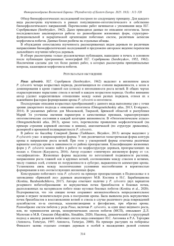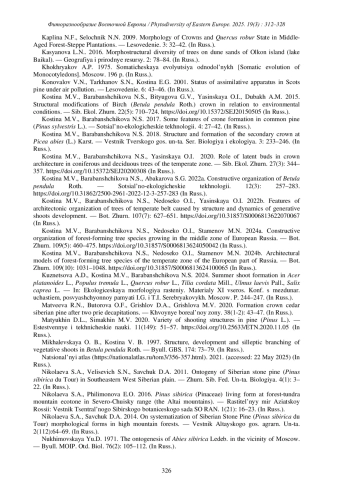 38. [Kostina et al.] Костина М.В., Барабанщикова Н.С., Недосеко О.И., Стаменов М.Н. 2024a. Конструктивная организация кроны лесообразующих видов деревьев средней полосы Европейской России. - Бот. журн. 109(5): 460-475. DOI: 10.31857/S0006813624050042