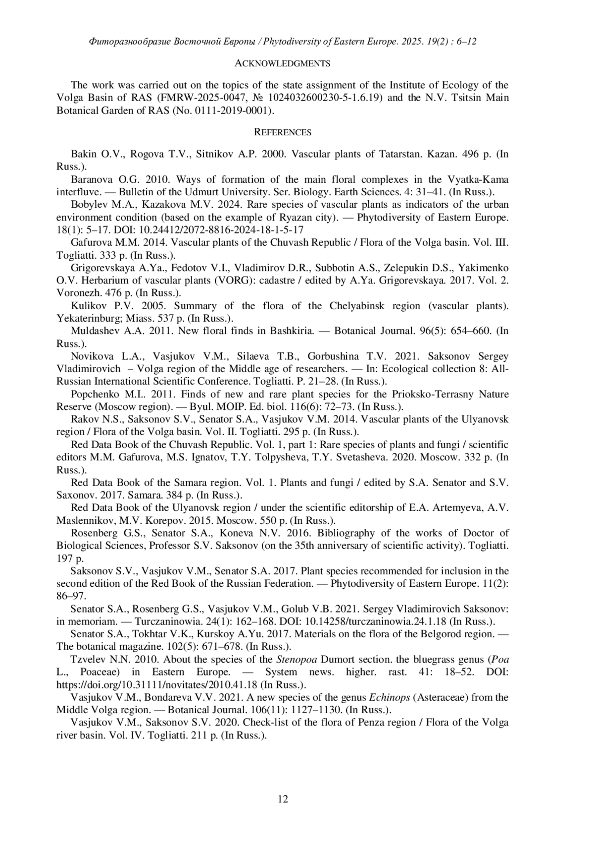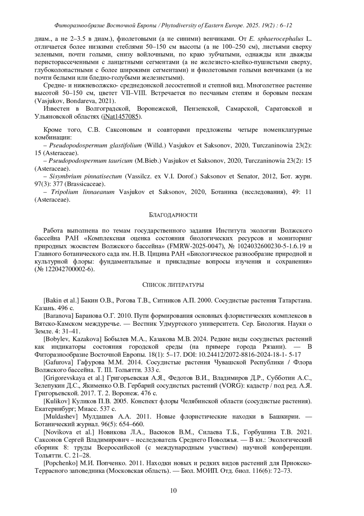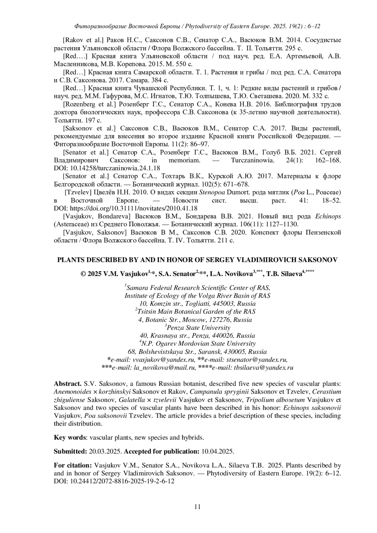 ВАСЮКОВ В. М., СЕНАТОР С. А., НОВИКОВА Л. А., СИЛАЕВА Т. Б. РАСТЕНИЯ, ОПИСАННЫЕ СЕРГЕЕМ ВЛАДИМИРОВИЧЕМ САКСОНОВЫМ И В ЕГО ЧЕСТЬ // ФИТОРАЗНООБРАЗИЕ ВОСТОЧНОЙ ЕВРОПЫ. 2025. Т. 19 № 2