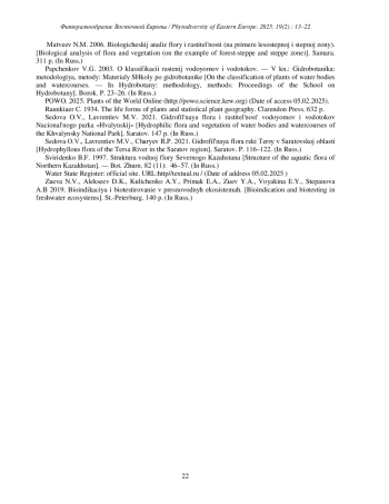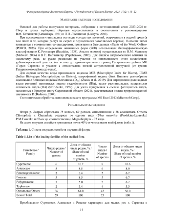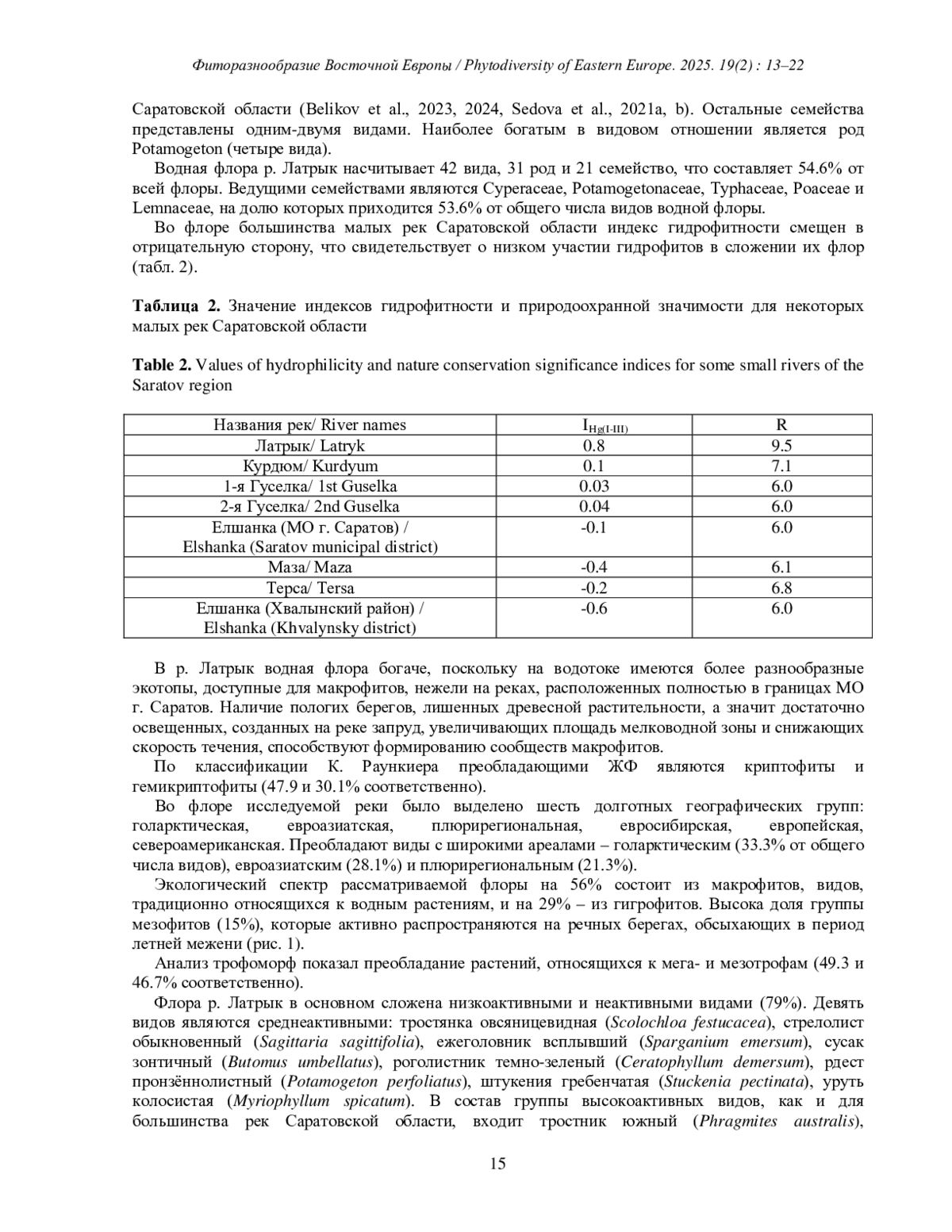В статье приведены результаты исследований флоры реки Латрык. Она включает 75 видов, 60 родов, относящихся к 38 семействам. Отделы Charophyta и Chlorophyta представлены по одному виду, Magnoliophyta 73 видами. Наибольшим разнообразием отличаются семейства Cyperaceae (10.6% от общего числа видов), Asteraceae (8.0), Potamogetonaceae (6.7), Poaceae (6.7), Polygonaceae (6.7) и Typhaceae (5.3%). Экологический спектр рассматриваемой флоры на 56% состоит из макрофитов, видов, традиционно относящихся к водным растениям, и на 29% - из гигрофитов. В период исследований подтверждены и выявлены местонахождения пяти видов растений, занесённых в третье издание Красной книги Саратовской области и трех видов, внесённых в «Аннотированный перечень таксонов и популяций грибов, лишайников и растений, нуждающихся в особом внимании к их состоянию в природной среде». Для изученной реки характерен очень высокий уровень трофности, по макрофитному индексу Sm исследованная река относится к классу «умеренно загрязненная».