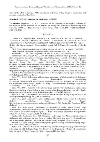 12. [Chkalov et al.] Чкалов А.В., Бирюкова О.В., Воротников В.П., Шестакова А.А., Бакка С.В., Мининзон И.Л., Соловьев А.А., Исаев С.С., Широков А.И., Аверкиев Д.Д., Гололобова И.А., Сырова В.В. 2023. Новые данные о местонахождениях видов Красной книги Нижегородской области по результатам исследований 2006-2021 гг. В кн.: Редкие виды живых организмов Нижегородской области. Вып. 6. Нижний Новгород. С. 32-38. EDN: ZDUFDK