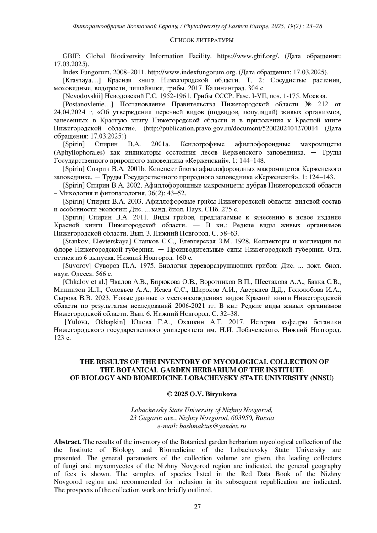 1. GBIF: Global Biodiversity Information Facility. https://www.gbif.org/. (Дата обращения: 17.03.2025). Index Fungorum. 2008-2011. http://www.indexfungorum.org. (Дата обращения: 17.03.2025).