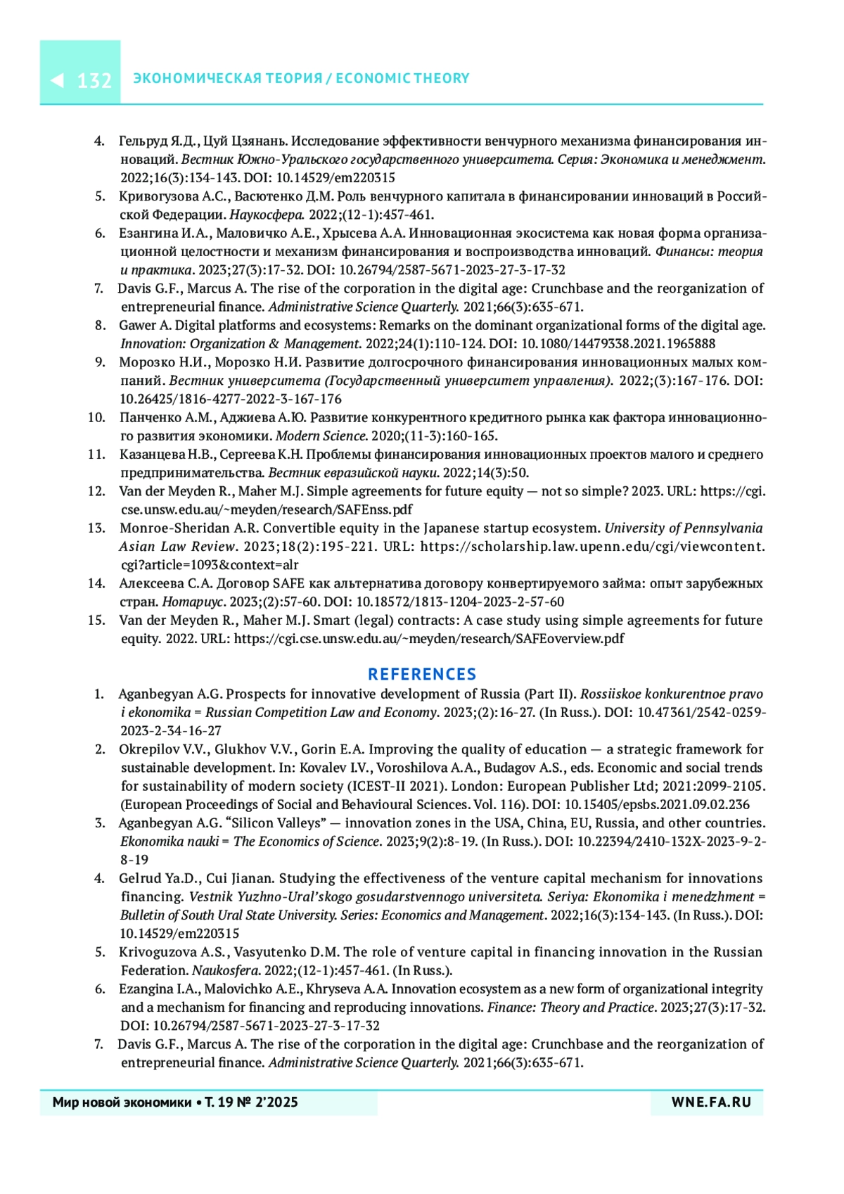 4. Гельруд Я.Д., Цуй Цзянань. Исследование эффективности венчурного механизма финансирования инноваций. Вестник Южно-Уральского государственного университета. Серия: Экономика и менеджмент. 2022;16(3):134-143. https://doi.org/10.14529/em220315