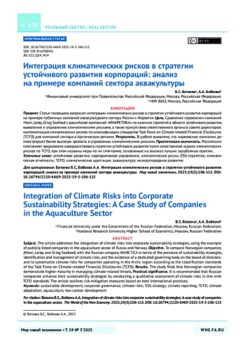 Предмет. Статья посвящена вопросам интеграции климатических рисков в стратегии устойчивого развития корпораций на примере публичных компаний аквакультурного сектора России и Норвегии.