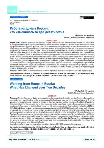 Актуальность. Развитие цифровых технологий в области коммуникации и связи оказало значительное влияние на рынки труда многих стран. Одним из последствий технологического прогресса в данной сфере стало изменение географии выполнения трудовых функций, в том числе увеличение доли работающих из дома. Дополнительный вклад в нормализацию этих процессов внесла пандемия COVID-19, вынудившая значительную часть работников перейти на удаленную занятость. Настоящая статья посвящена исследованию этого явления на российском рынке труда с 2006 по 2023 г.