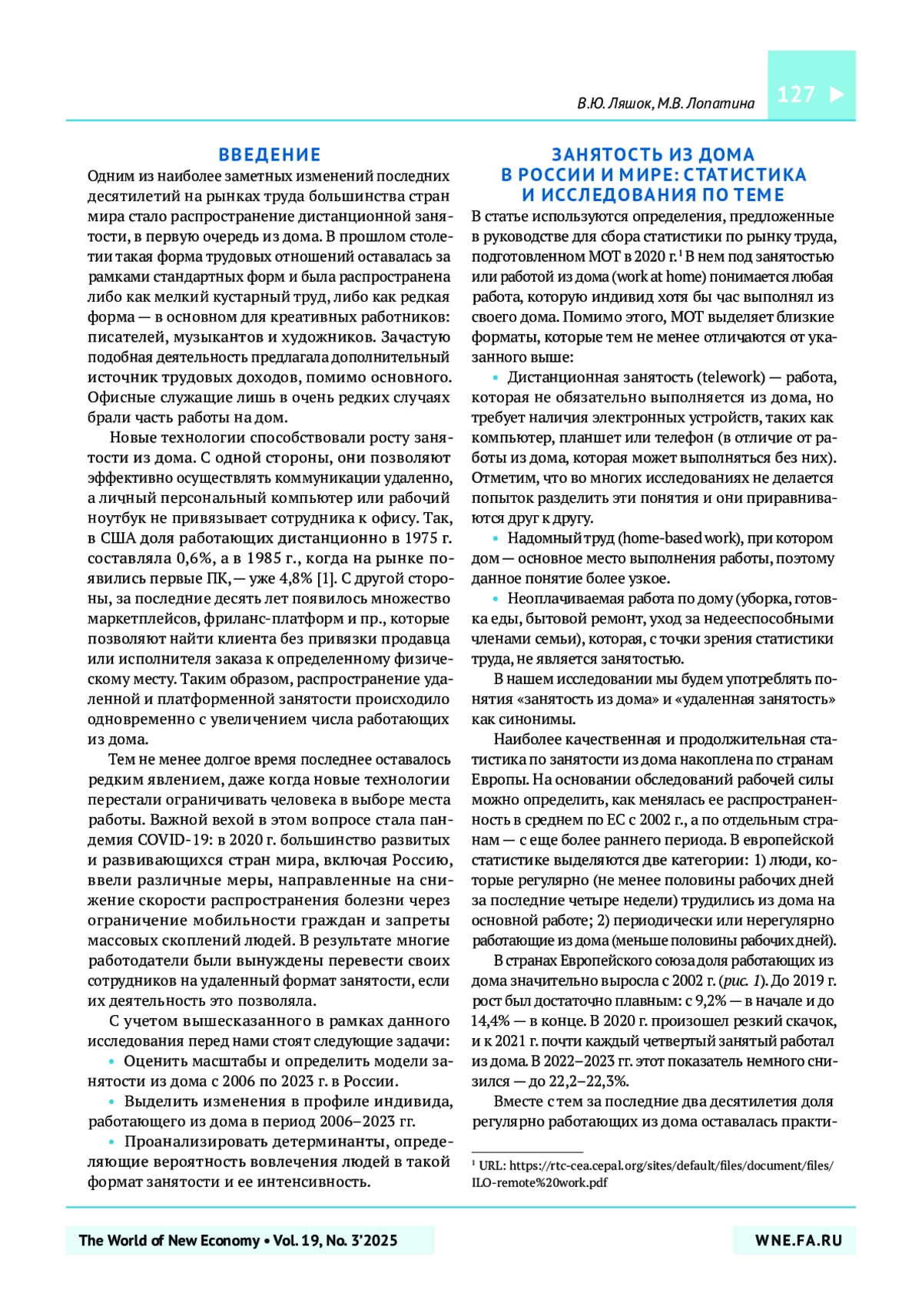 19. Капелюшников Р.И., Зинченко Д.И. Цифровые формы занятости на российском рынке труда. Часть I: дистанционная занятость. Мониторинг общественного мнения: экономические и социальные перемены. 2024;(6):157-181. https://doi.org/10.14515/monitoring.2024.6.2654